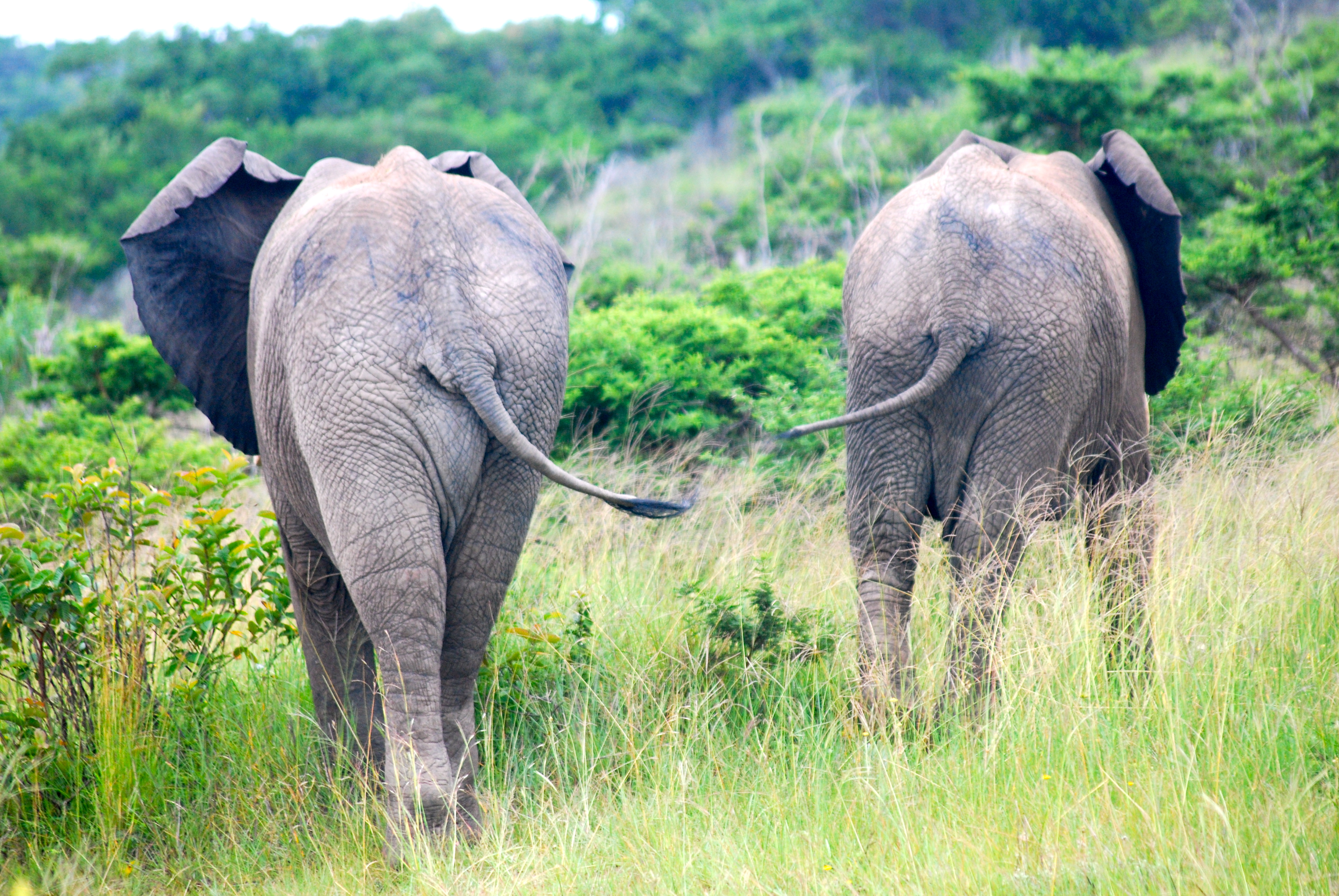 African elephants, Inkwenkwezi Game Reserve, South Africa.  I think this is my favorite photo of them.  Note the tails. ©Jean Janssen