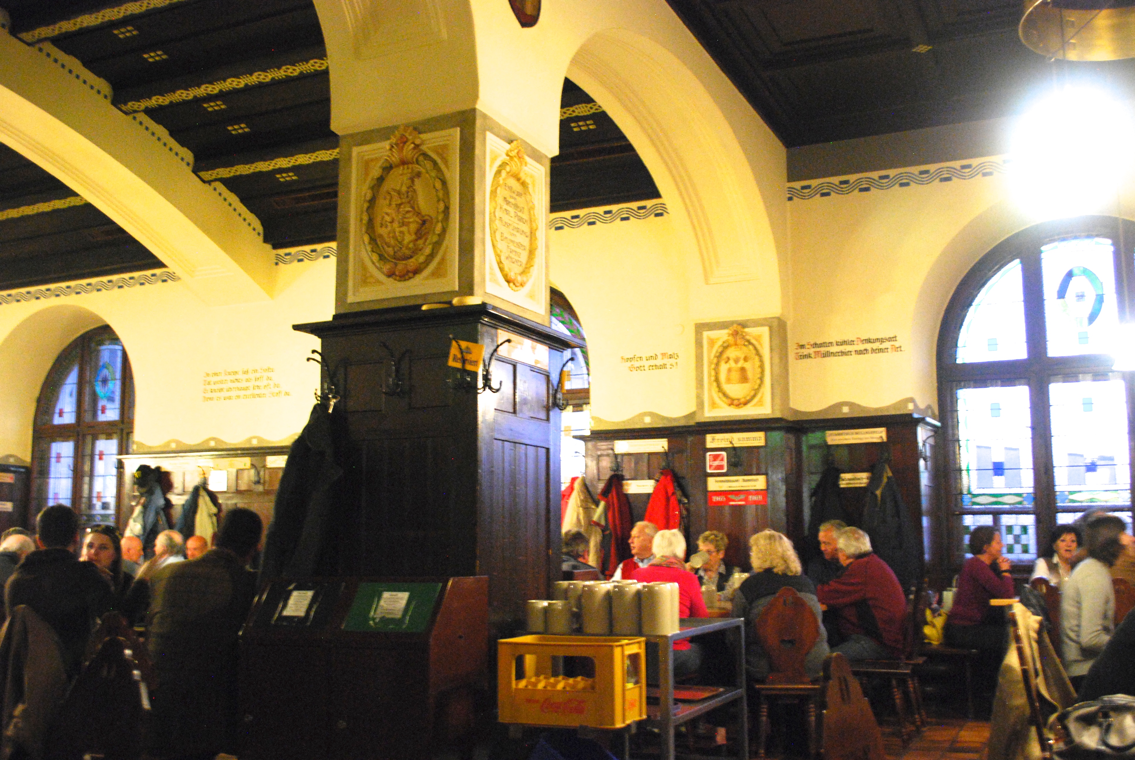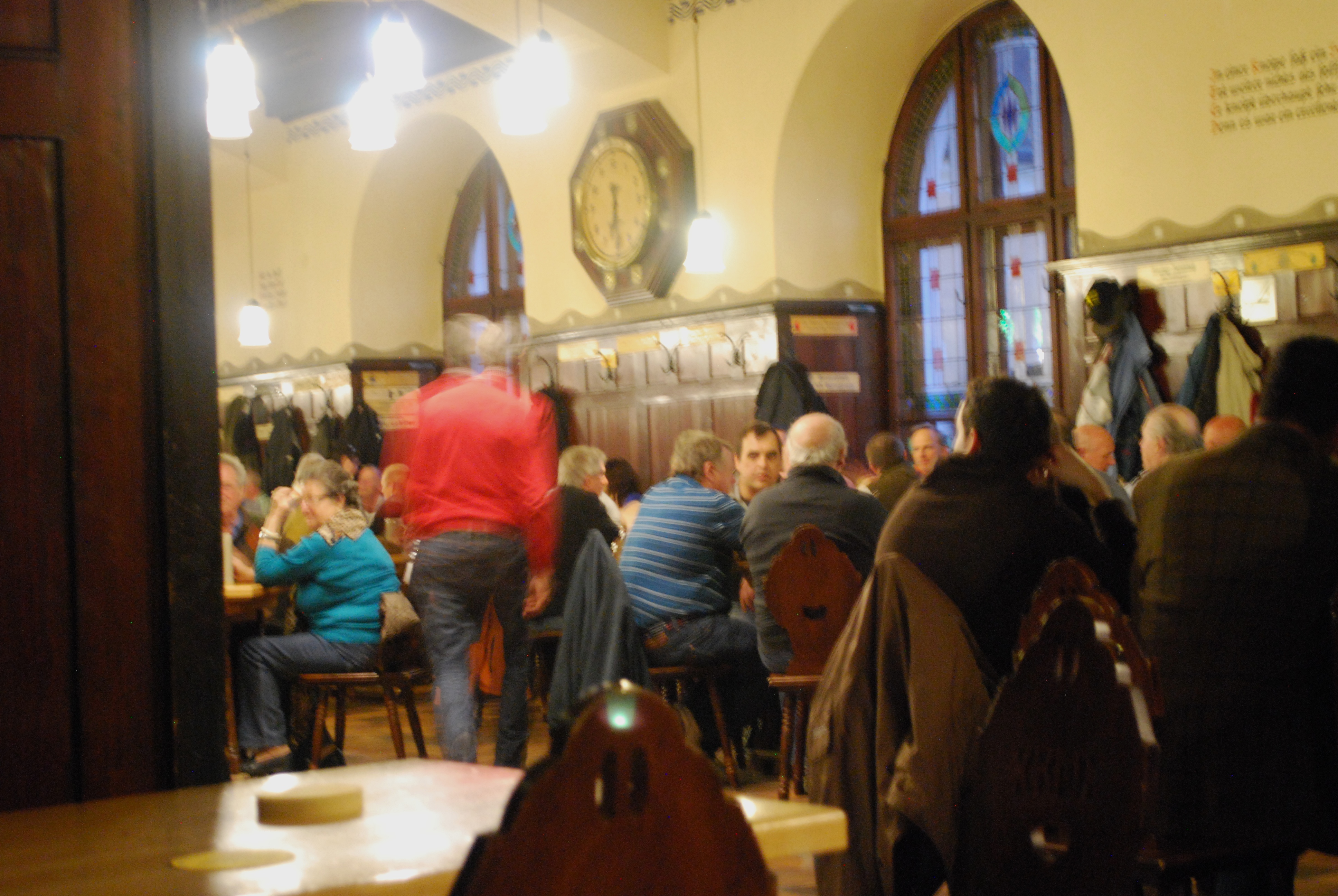 This is an old, large wooden beer hall with stained glass windows and carved wood accents. You sit on long benches against the wall or on carved wooden chairs. Talk about people watching. The place was packed; we actually had trouble finding a seat. We got there about 6 pm and it was an older crowd. About 7, it began to transition to a younger group. There were very few tourists and the locals clearly have their regular seats. I tried to discreetly take pictures, without being able to really do the room justice.