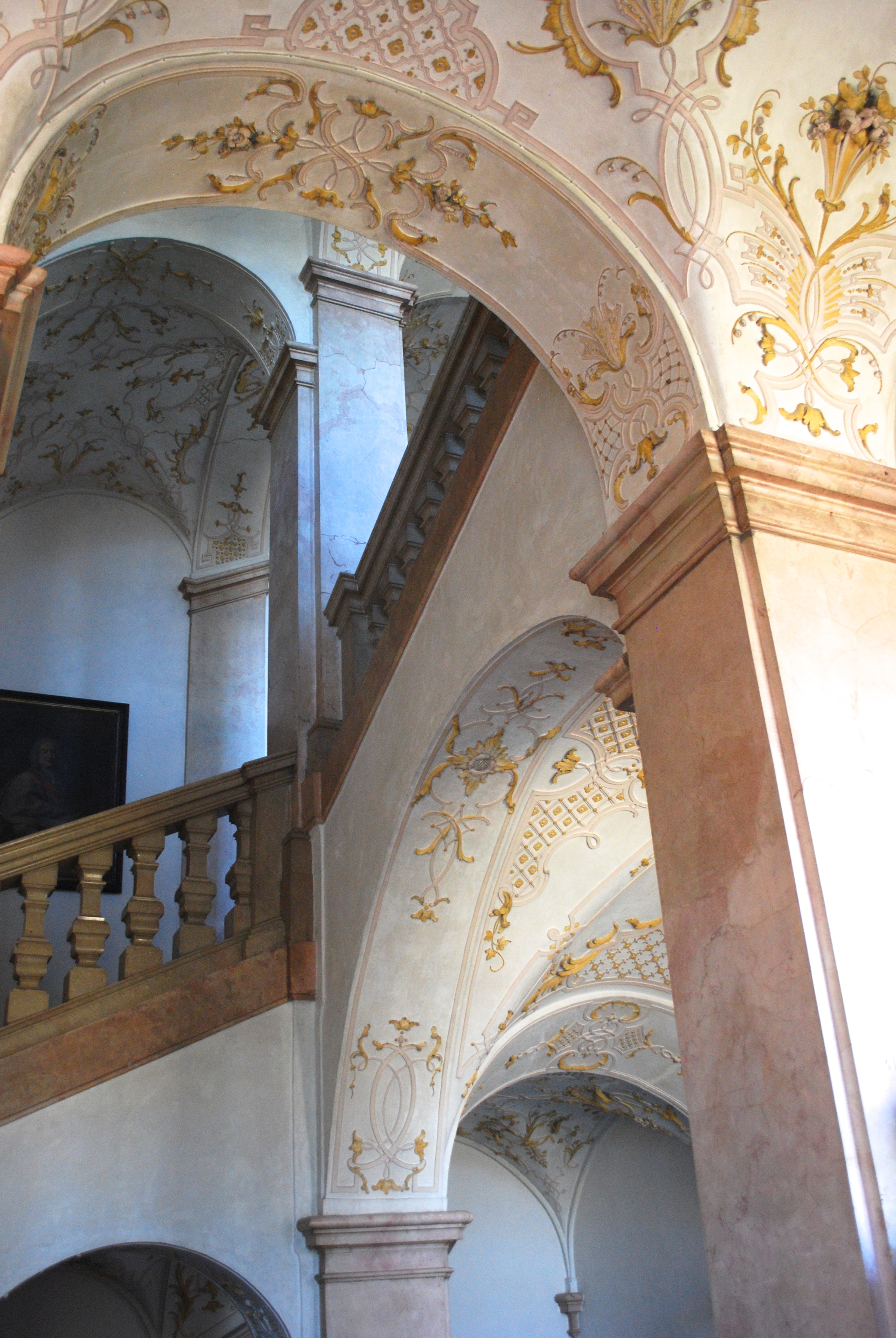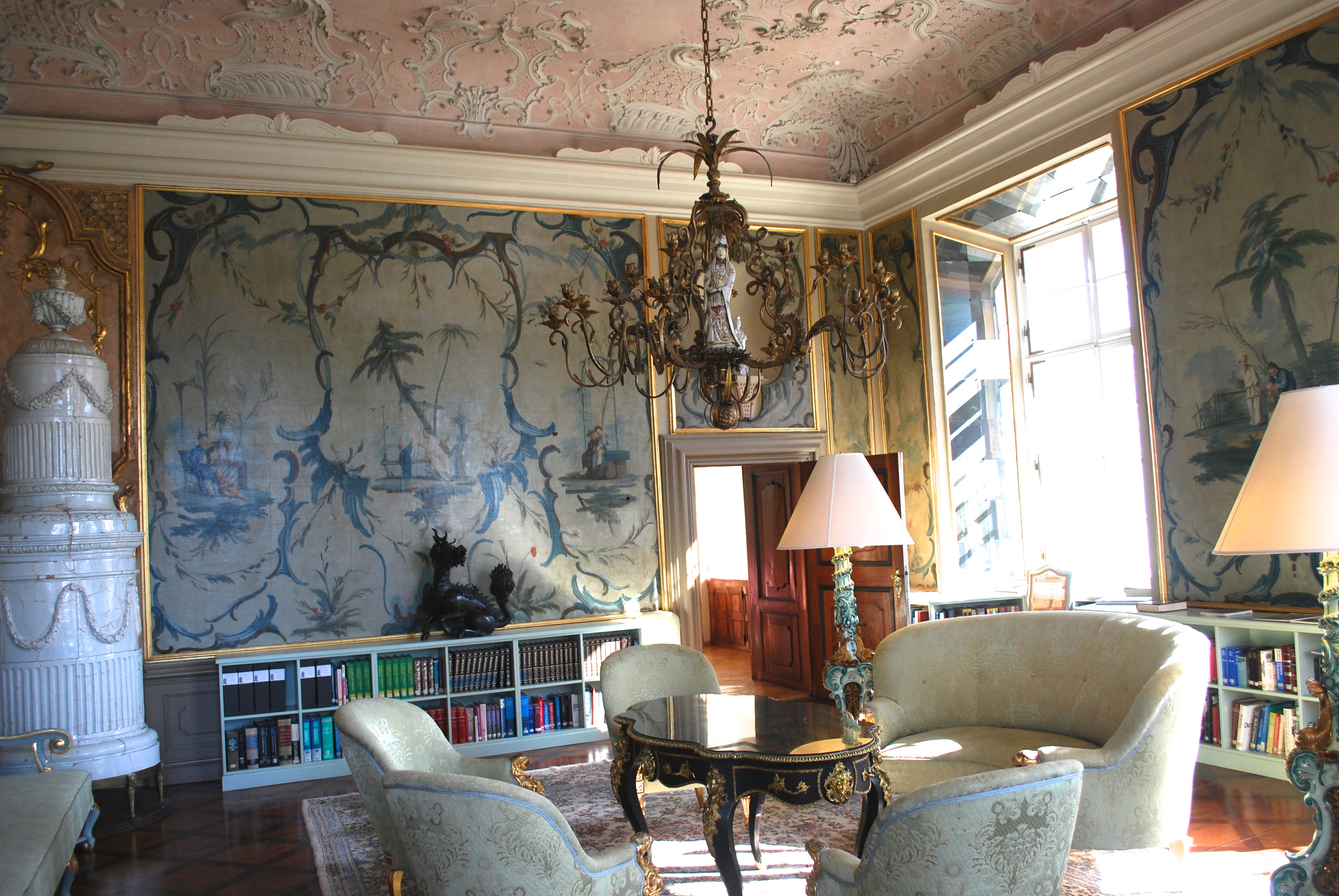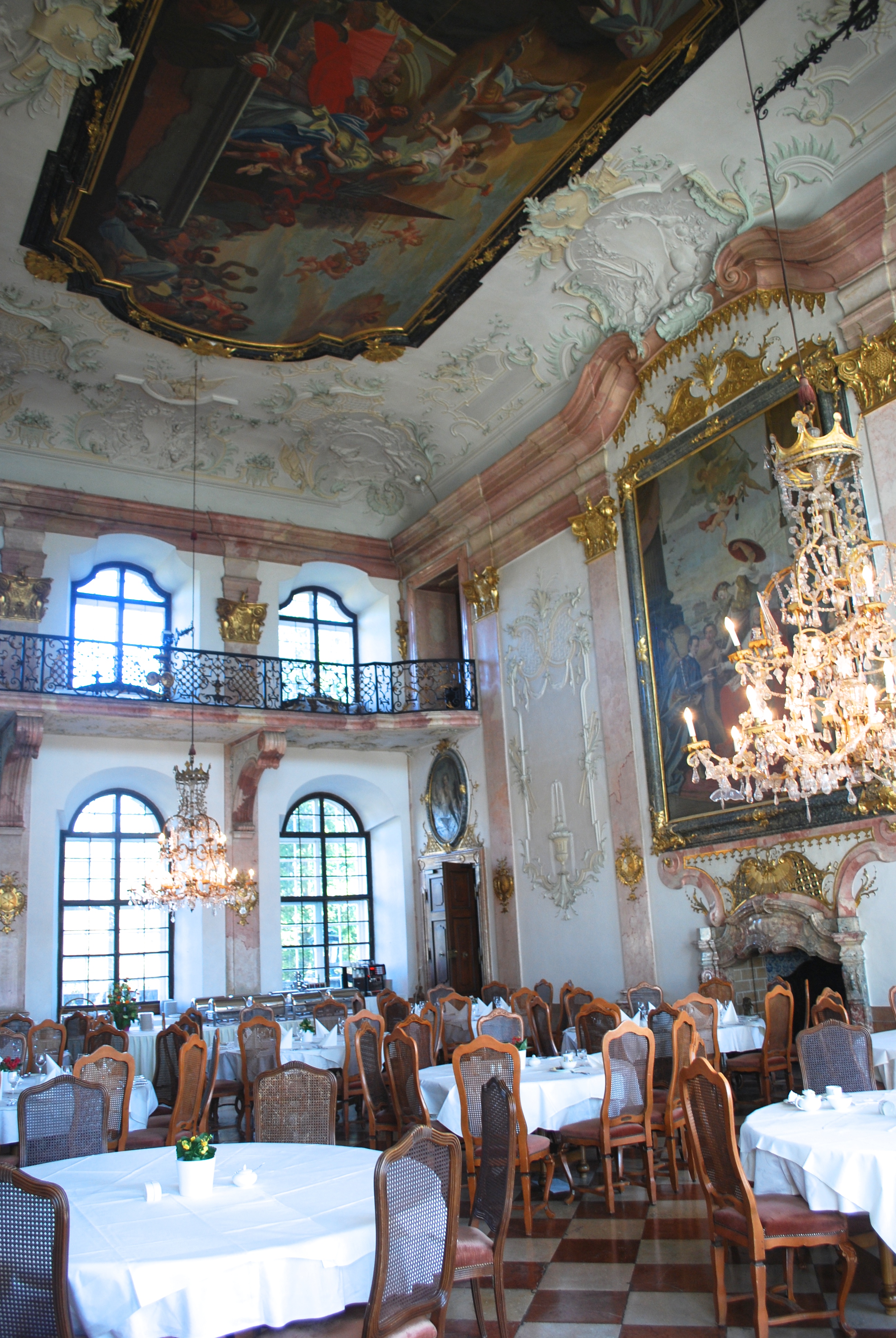 Boris wanted to meet up after his meetings today, so I didn’t have time to take the bus to the Untersberg cable car as planned. Instead, I walked around the Schloss and took more pictures. You have already seen photos of the Venetian Room, Chapel, and the Terrace Gardens facing the lake, but there are more public spaces available to guests of the hotel. On the first floor (second floor under the American way of counting), is the most spectacular private library I have ever seen. I can’t tell you about the book collection, but the room was amazing. I even had the chance to go up to the second floor library balcony, reached by a secret entrance. The hidden staircase allowed the Archbishop, the original owner, to move between his bedroom suite and both floors of the library without encountering any “commoners”.