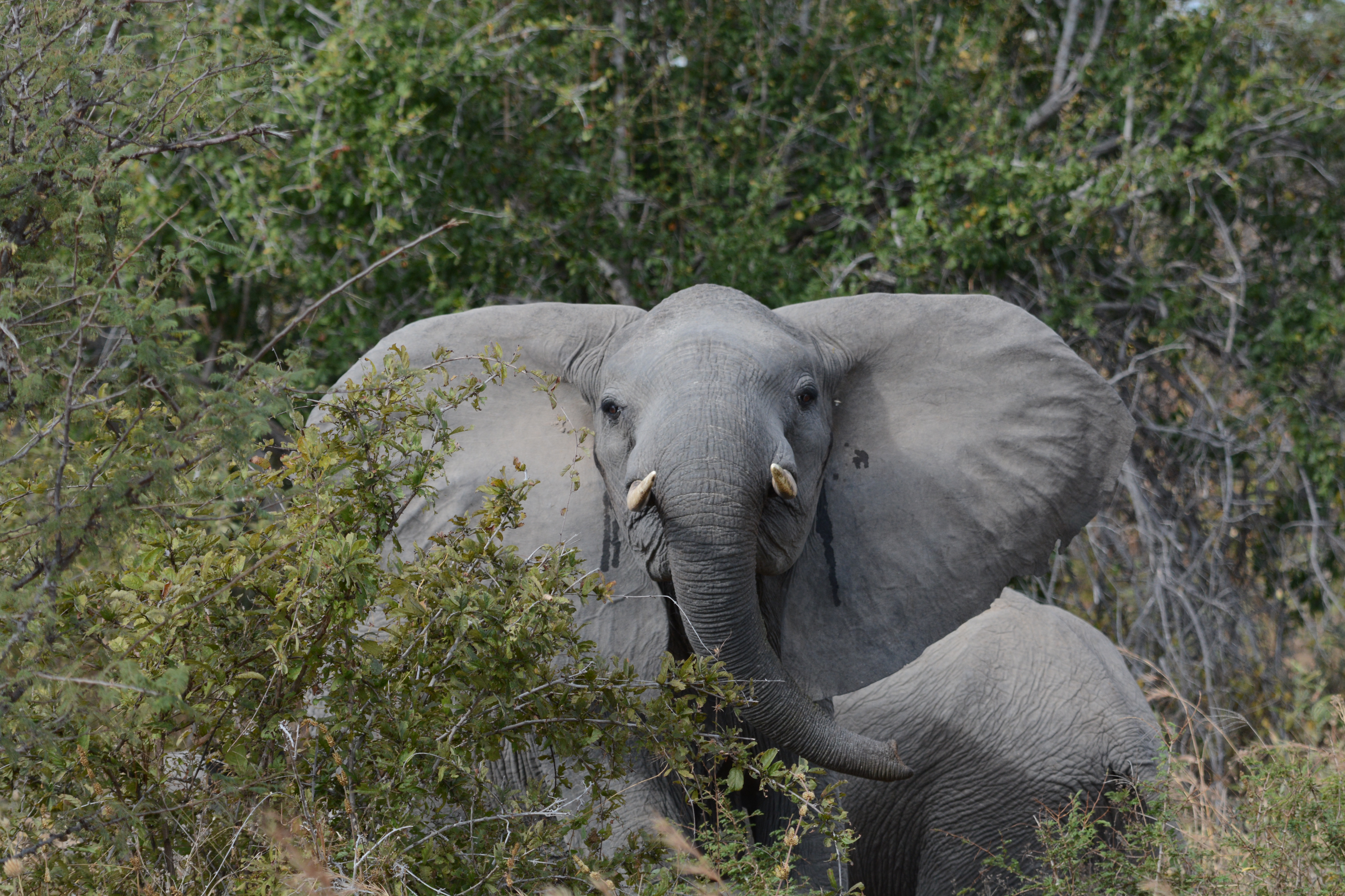 Donna resting, there are only three of us in the Jeep this afternoon with Frank. We quickly came across a herd of elephants with three “babies”. They were curious, but one of the “teenagers” did a mock charge to let us know not to get any closer. I noticed what looked like gashes along their faces. Frank explained that these were sweat glands that become more prominent when the animal becomes stressed. With little ones to protect, I am sure our presence was not exactly welcome.