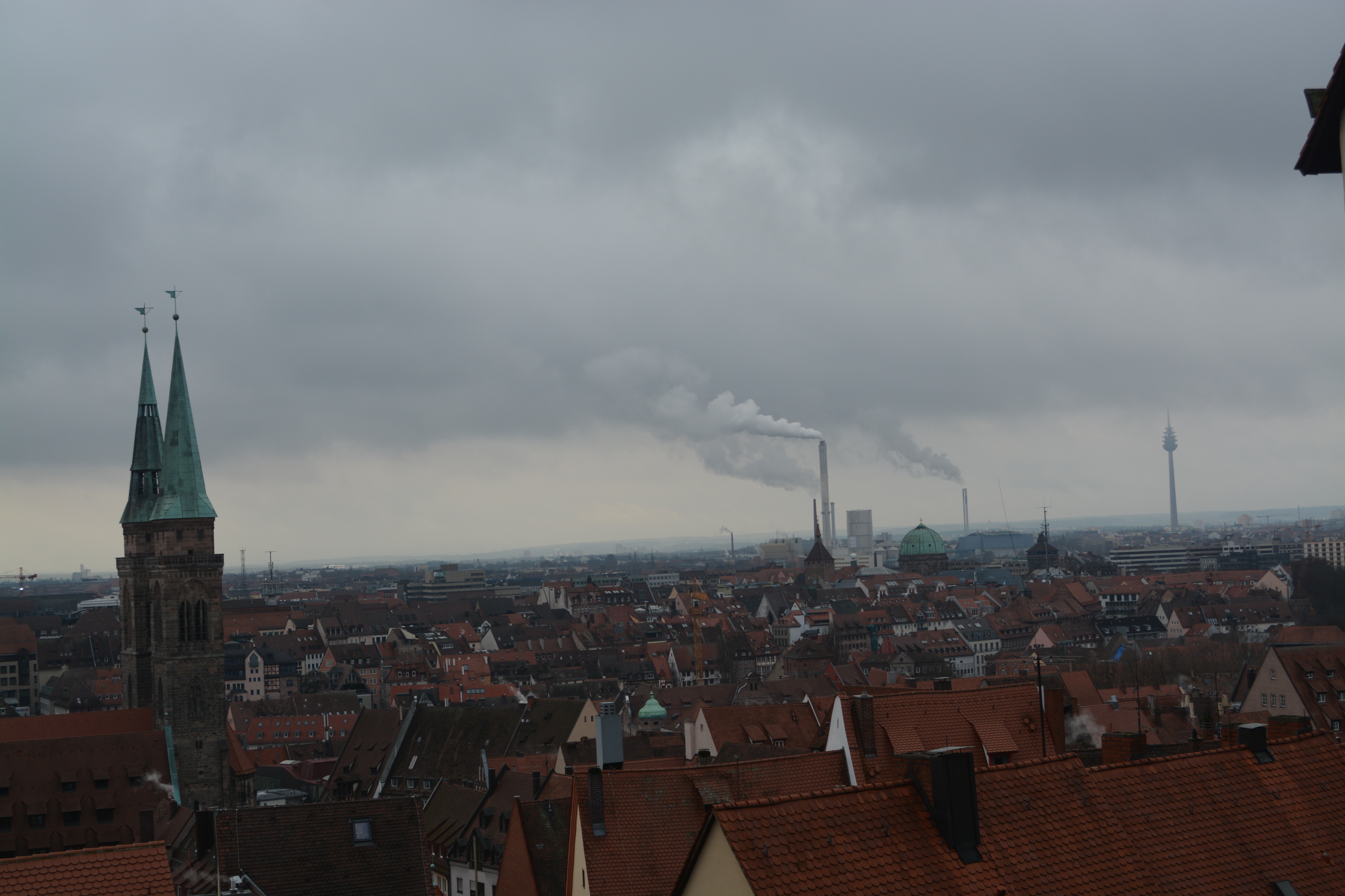 Skyline of Nuremberg from the castle. Note the industrial smokestacks, communications tower, and the church spires-symbols of the city past and present
