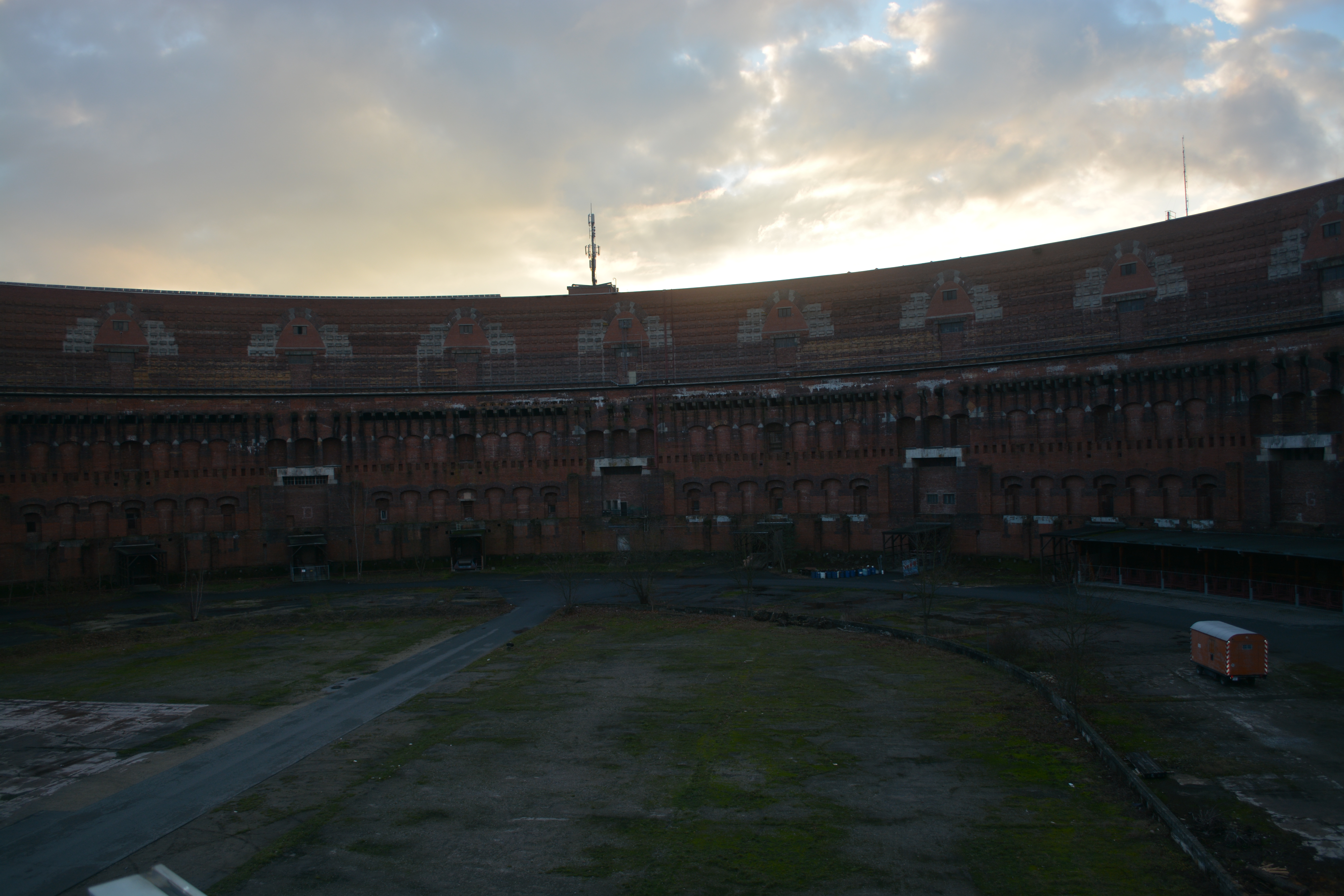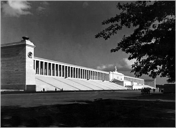 100,000 men could stand in Zeppelin field while another 60,000 could sit in the grandstand and surrounding stadium seating. The stastika on the grandstand was destroyed by American military after the War and in 1967 the city removed the roman columns and backdrop from the stage to keep the grounds from being a pilgrimage site for neo-nazis. Zeppelin Field was part of a much larger, multi-building complex that was to be completed after the war.