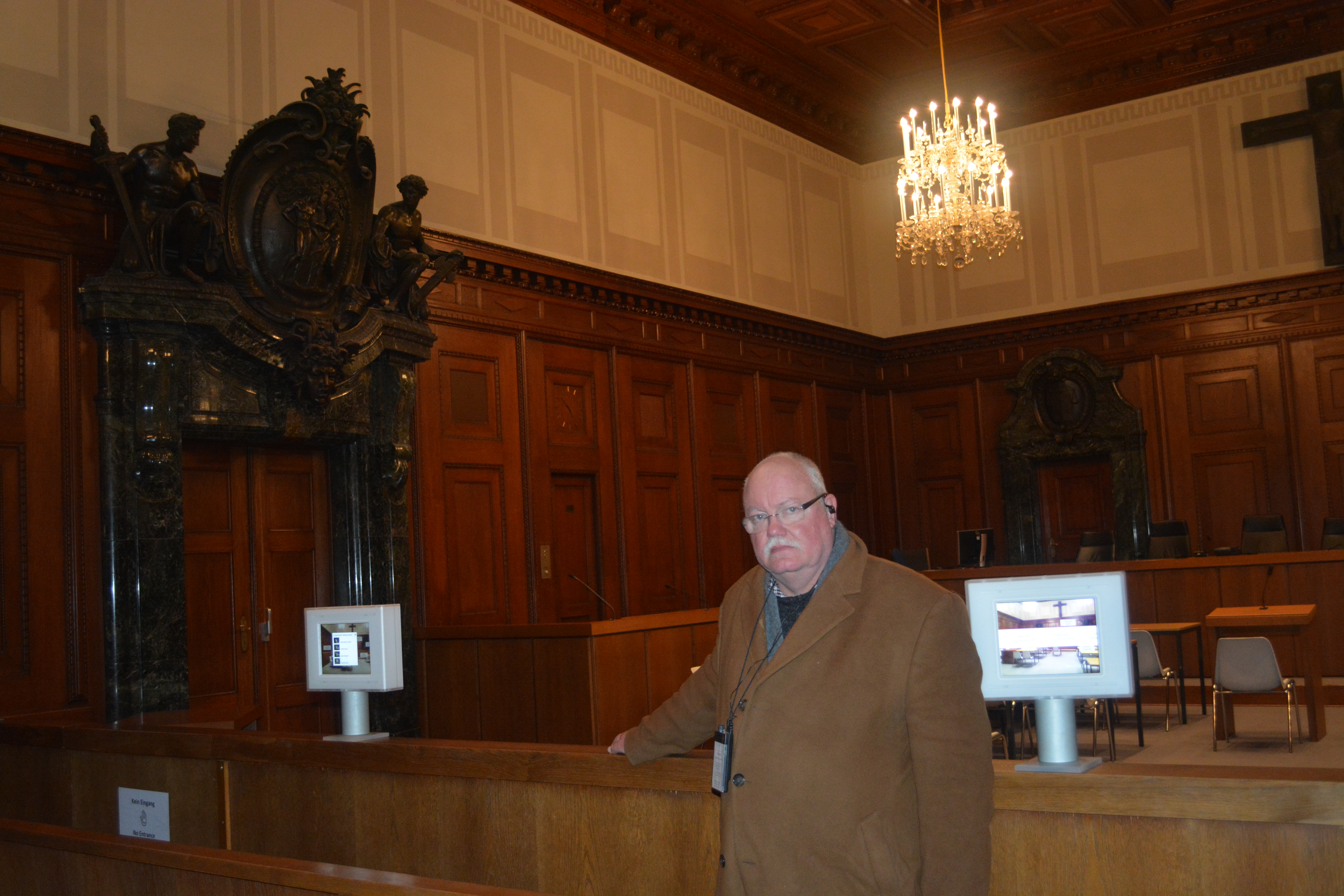 Boris in the courtroom at the Palace of Justice site of the Nuremberg Trials. The defendants block is against the wall with the elevator control and doors visible against that wall.