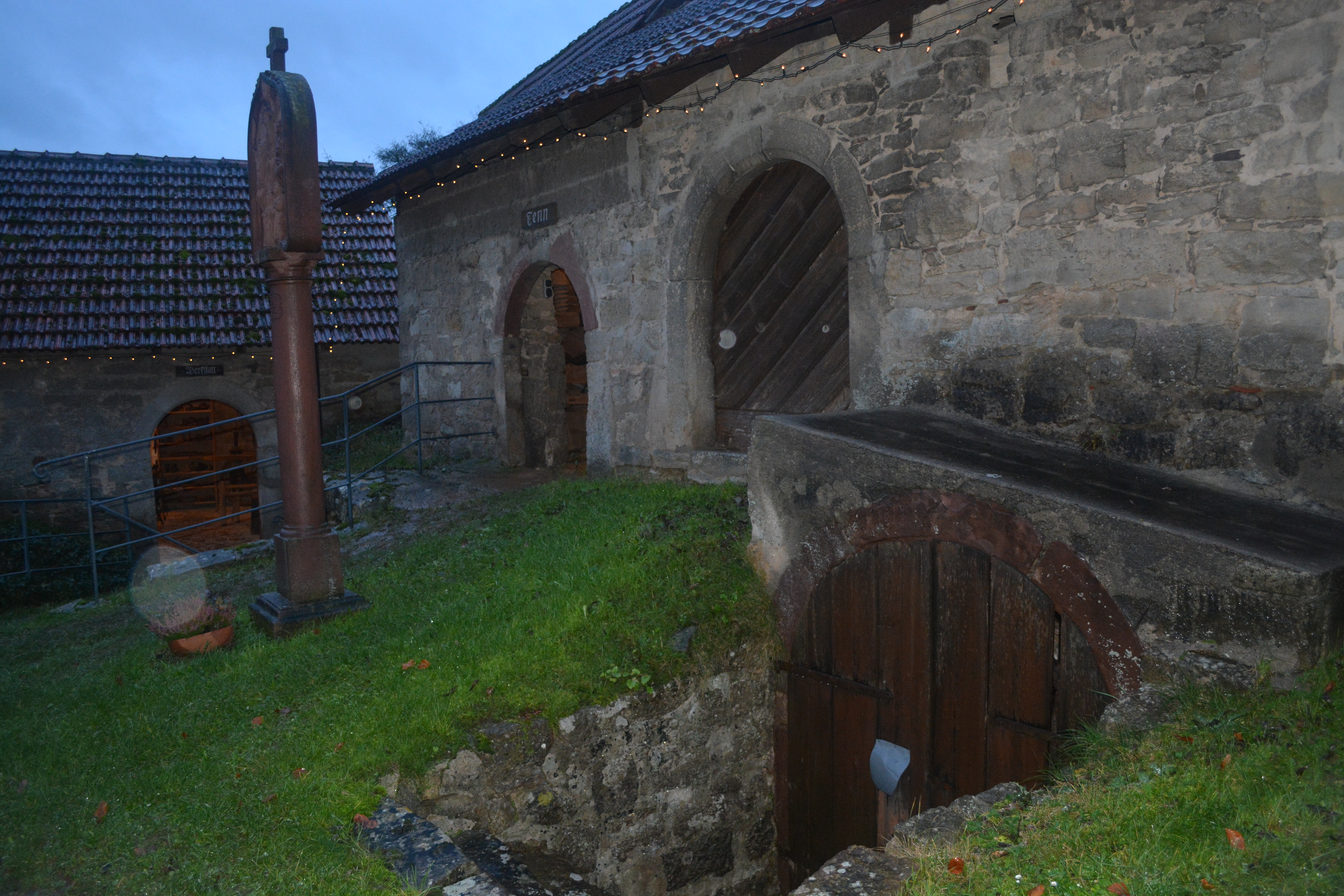 We had about a 40-minute drive to Aschfeld. The local hosts spoke only German so our guide translated, meaning all the jokes were delayed. We met in the church and were told about the history and the museum layout. Achfeld is at the intersection of two medieval trade routes. The church-castle was a medieval fort used by the citizens when under siege by “rambling warriors”. When a confrontation was anticipated, the villagers moved themselves and all their belongings (including animals) into the compound. The wall provided a four-story stronghold with a watchtower last used for shelter during the 30-years war. The fortress has never been breached, mostly likely owing more to the poverty of the inhabitants rather than the inability to breach the 4-story walls.