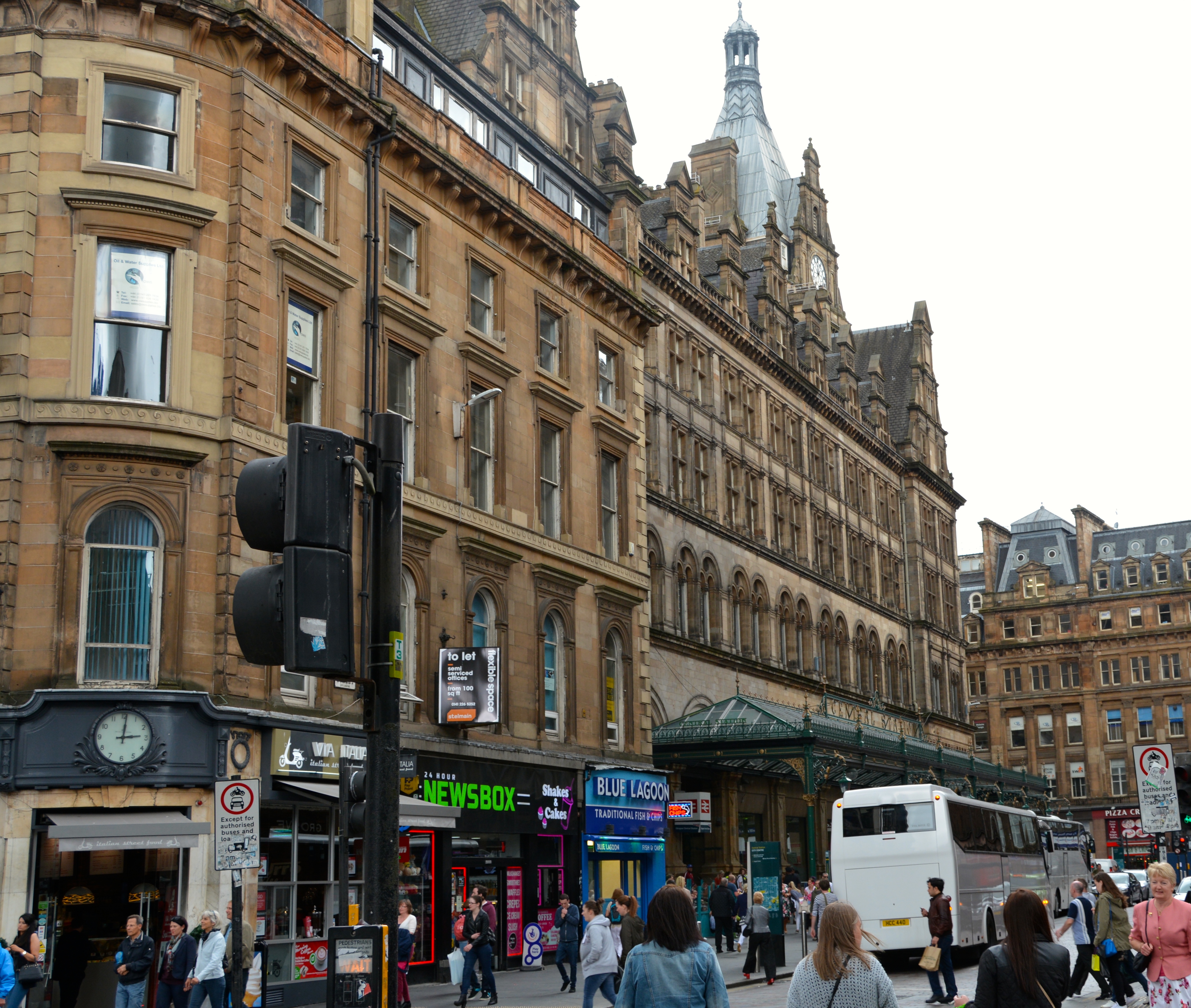 Glasgow Central Train Station. Note the great metal awning and the fish and chips shop right next door.