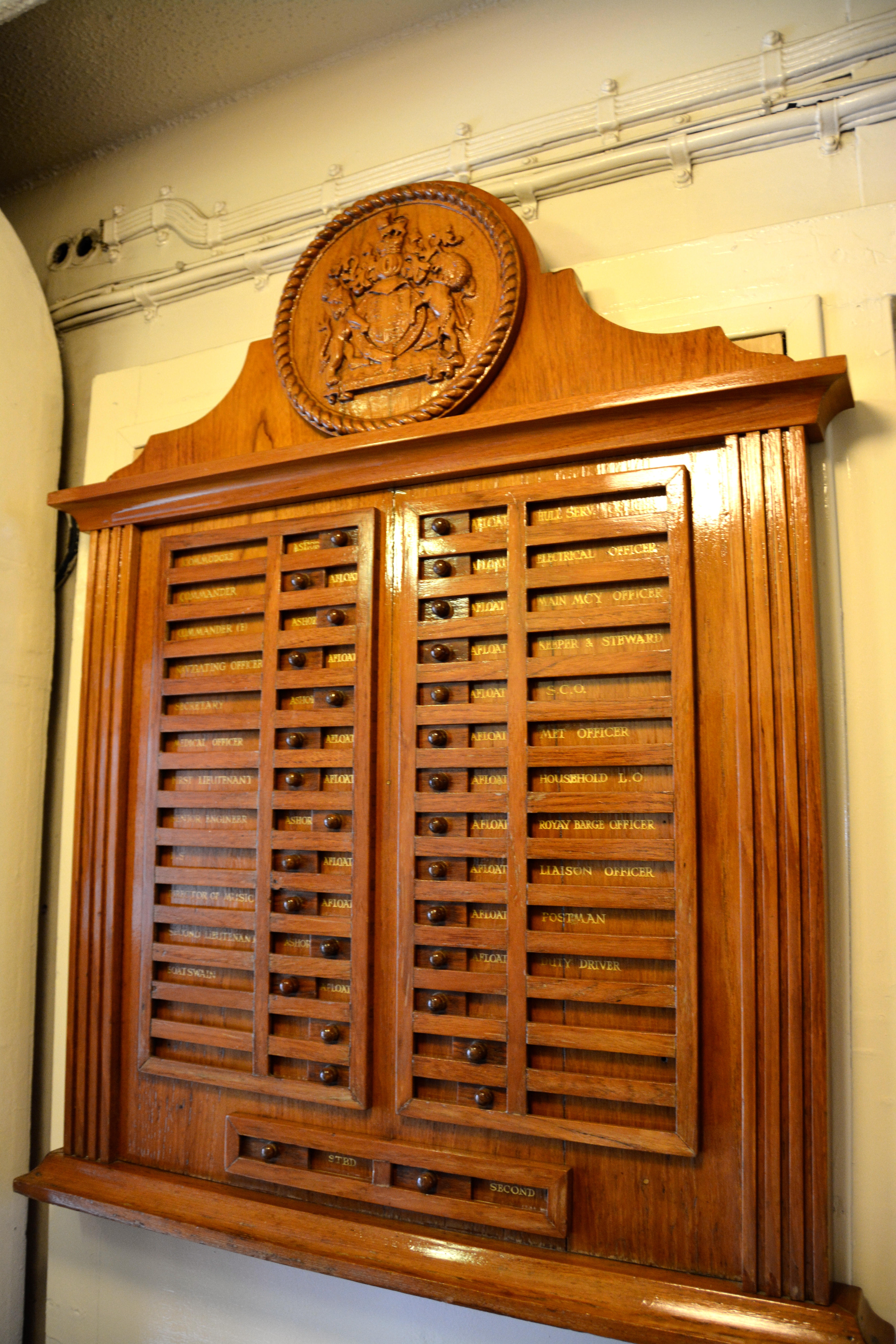 This sliding panel board showed who was on or off the ship on the Royal Yacht Britannia.