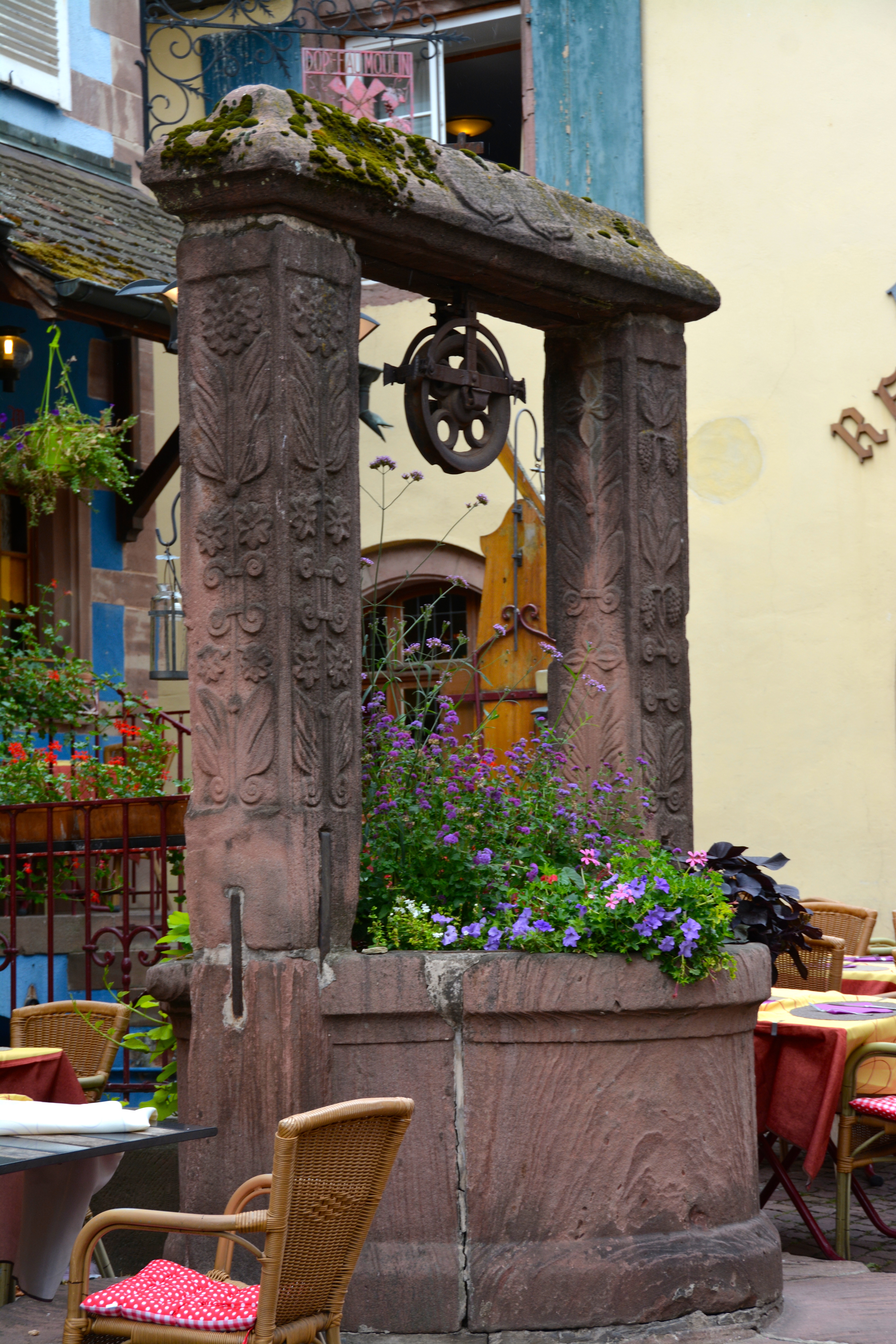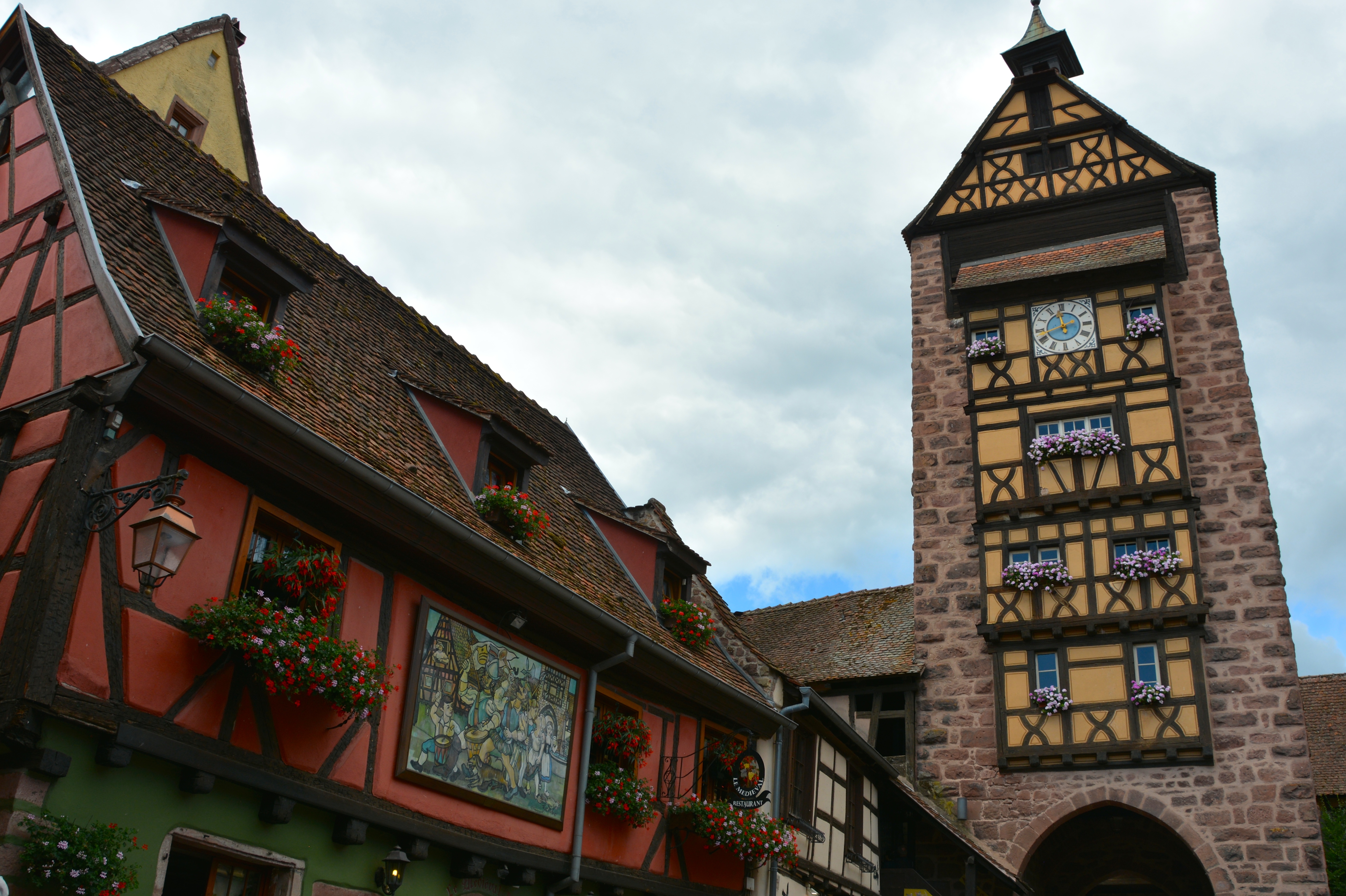 Our guide will be leaving us in Riquewihr.  She walked us into the town and pointed out a few things.  She recommended going into one of the many tasting rooms to try the local wines.  She mentioned the sparkling and I was all over that.  We also had the chance to try a couple of the local treats including the best coconut macaroons I have ever eaten.  I bought a variety pack to take home, liking the orange-flavored the best.  We also tried a Alsatian specialty, flammekuchen, a flat bread topped with onions and bacon.  It was fabulous.
