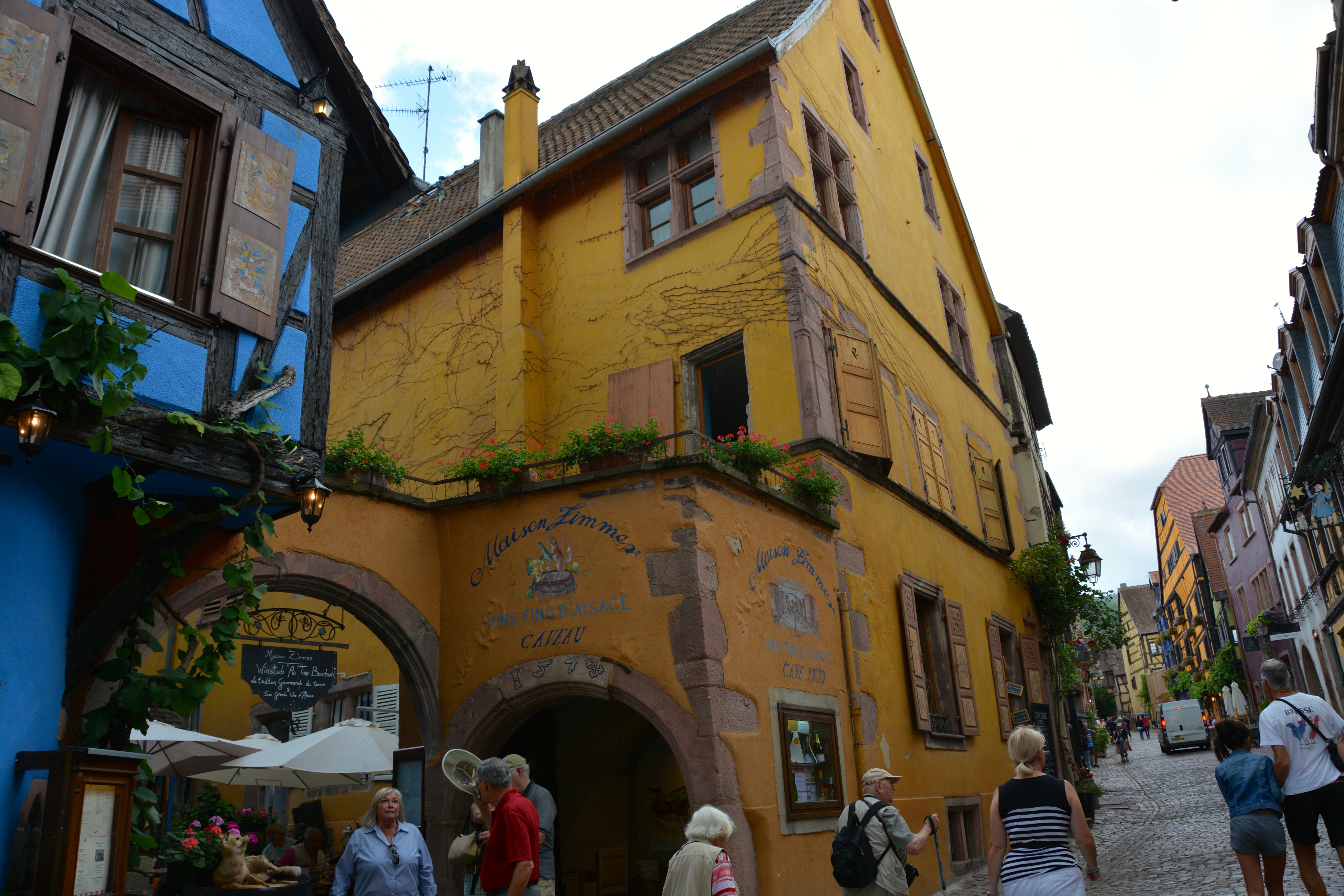 In route to Riquewihr, our guide told us about some of the other features of the region.  With the industrial revolution, people had moved down from the mountains and populated the area.  In modern times, the Rhine was harnessed for hydro power with 11 hydro power plants along the Rhine in France.  Farmers in the area also receive corn subsidies, making profit on the subsidies not on the sale of corn; subsidies are provide to prevent massive imports of corn from the United States.  In France, the corn is not commonly consumed but used to feed cattle.