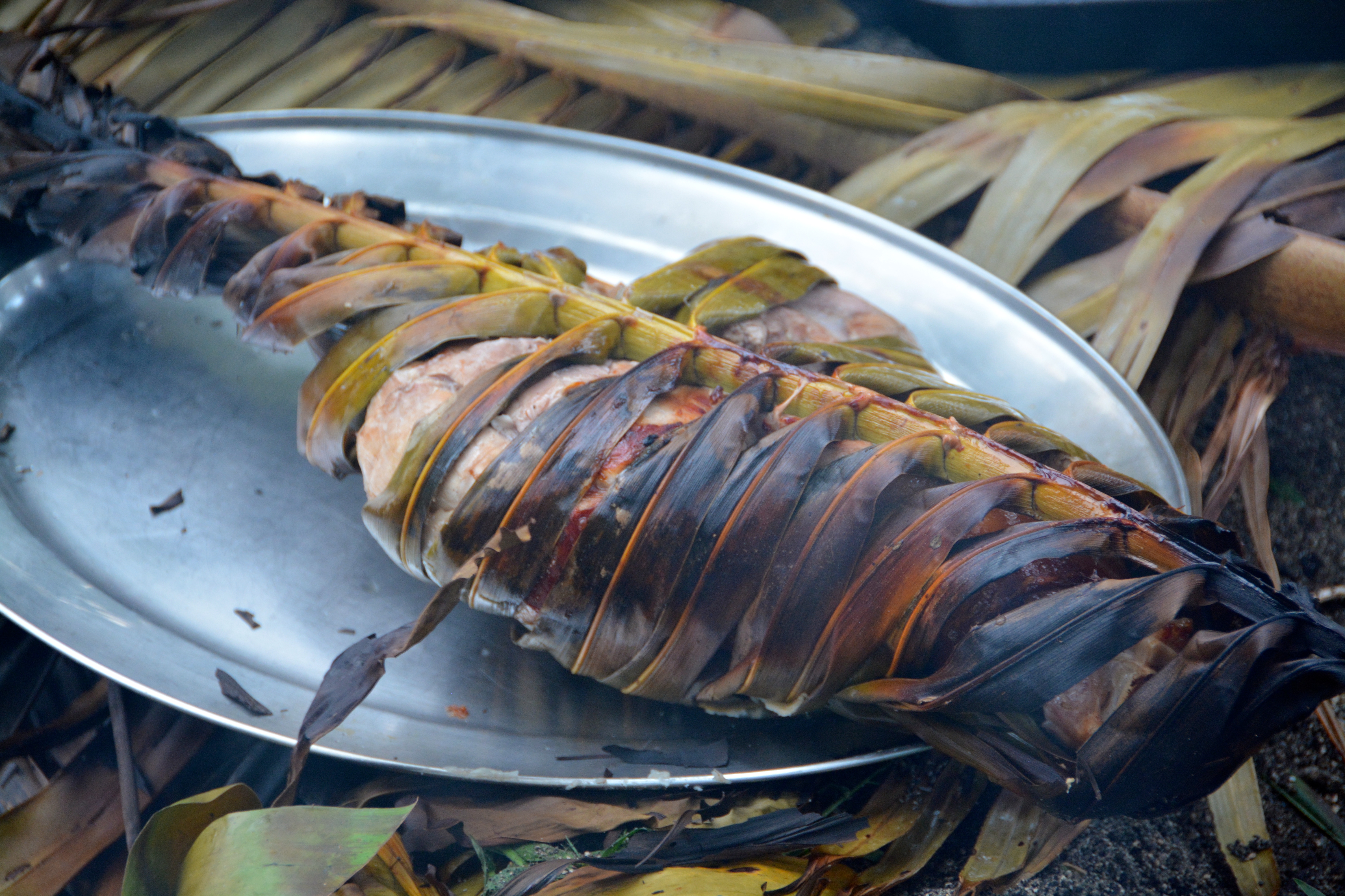 ©Jean Janssen. Cooked meat wrapped in palms that has been removed from the lovo.
