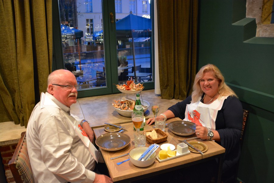 Natasha and Boris at Den Dijver along the canal in Bruges, Belgium.