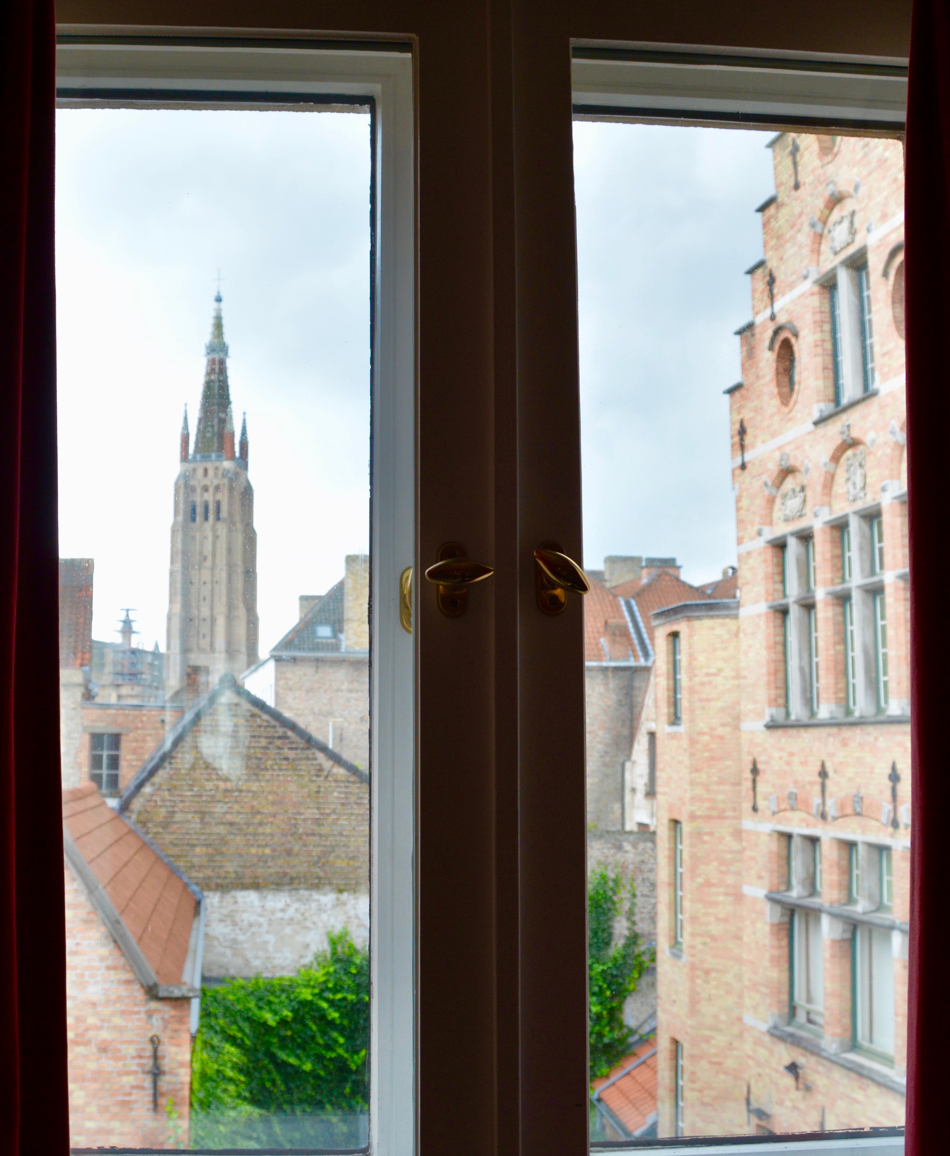 Photo ©Jean Janssen. The view from our room at Maison Le Dragon in Bruges includes a view of the spire of The Church of Our Lady.