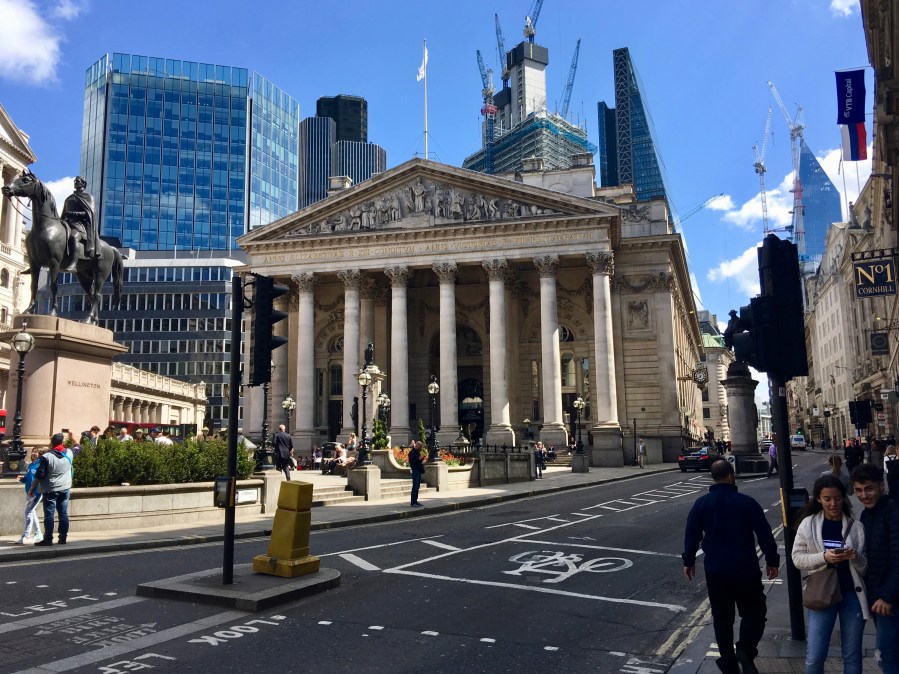 The Mansion Houston, the official residence of the Lord Mayor of London with a statute of Wellington in front. Across the street is the Bank of England.
