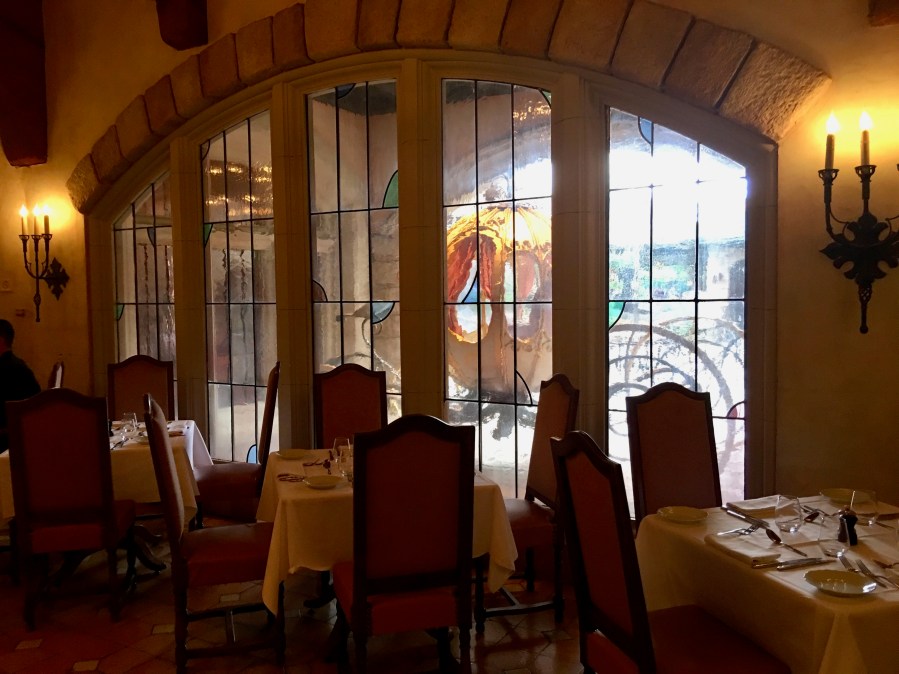 Photo ©Jean Janssen. The XXX restaurant in Sleeping Beauty Castle at Disneyland, Paris. A pumpkin carriage is parked outside.