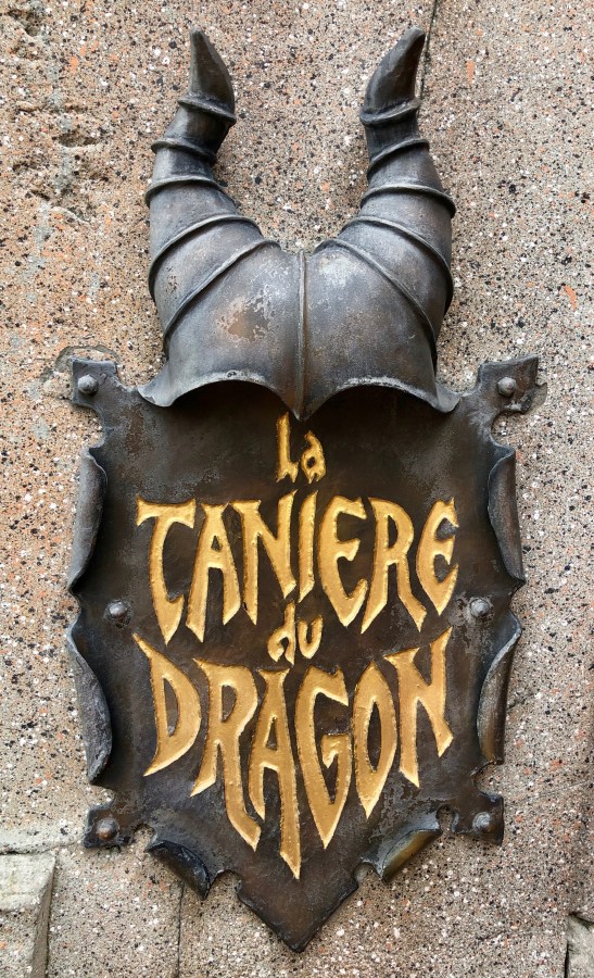 Photo ©Jean Janssen. Loved Malificent’s hat on the sign for the entrance to the dragon’s dungeon in Sleeping Beauty’s Castle in Disneyland Paris.
