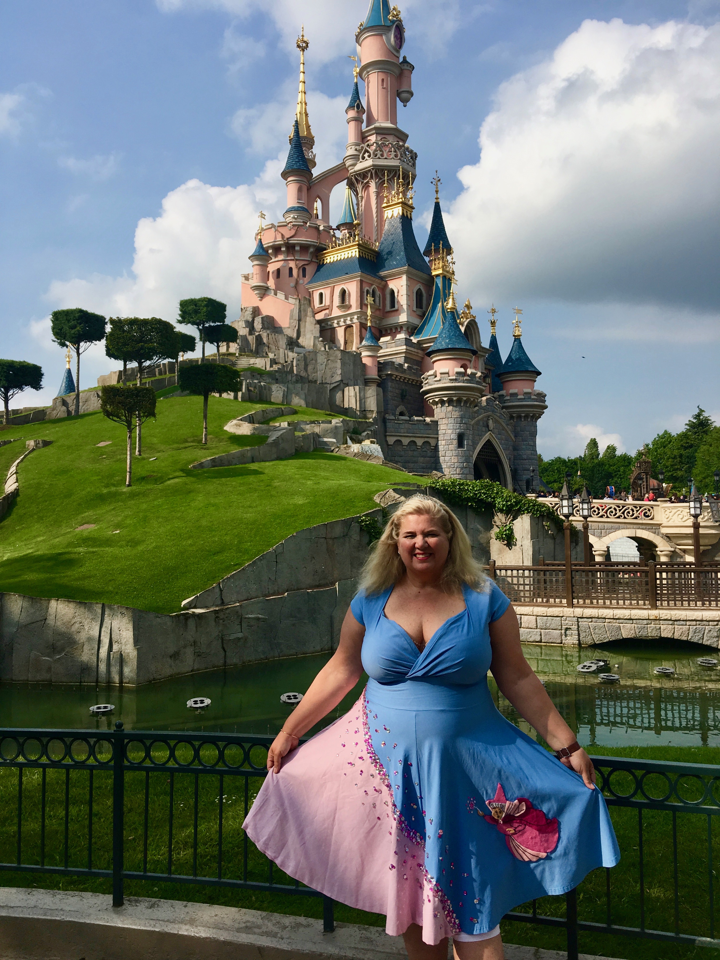 Sleeping Beauty Castle at Disneyland Park, Disneyland Paris. Natasha shows off her custom dress by Maggie highlighting the movie featuring her favorite Disney Princess, Aurora, aka Sleeping Beauty.