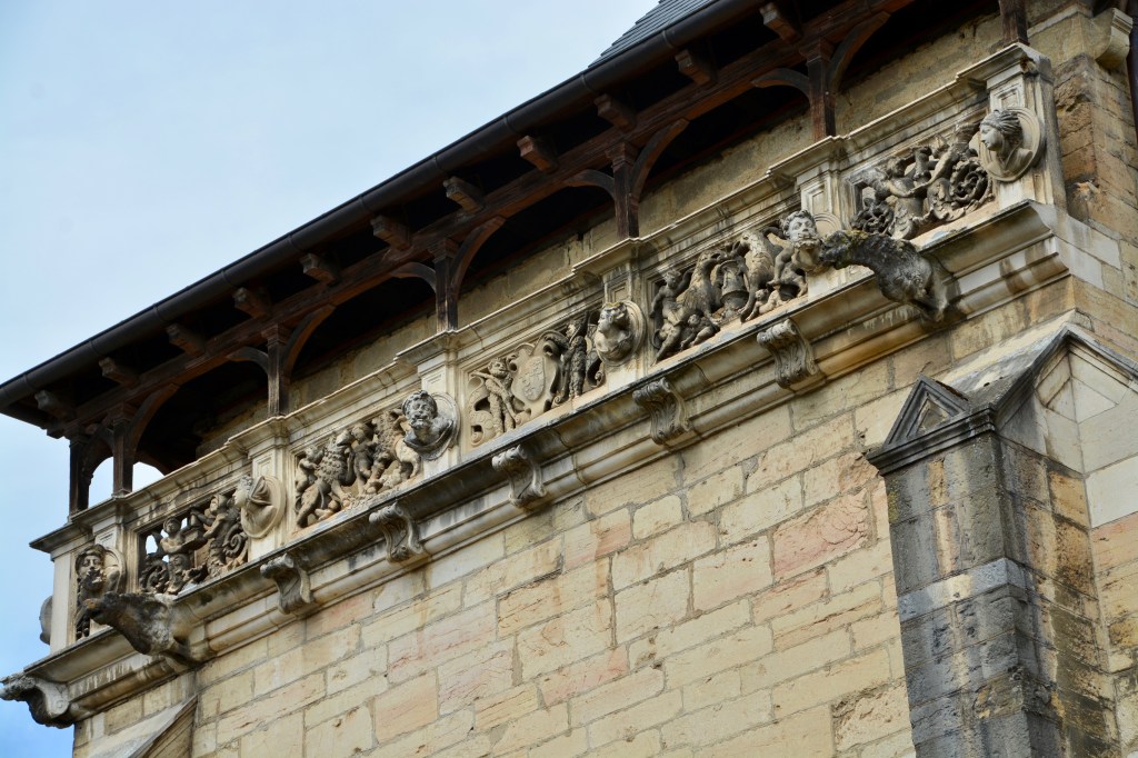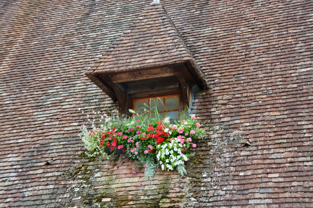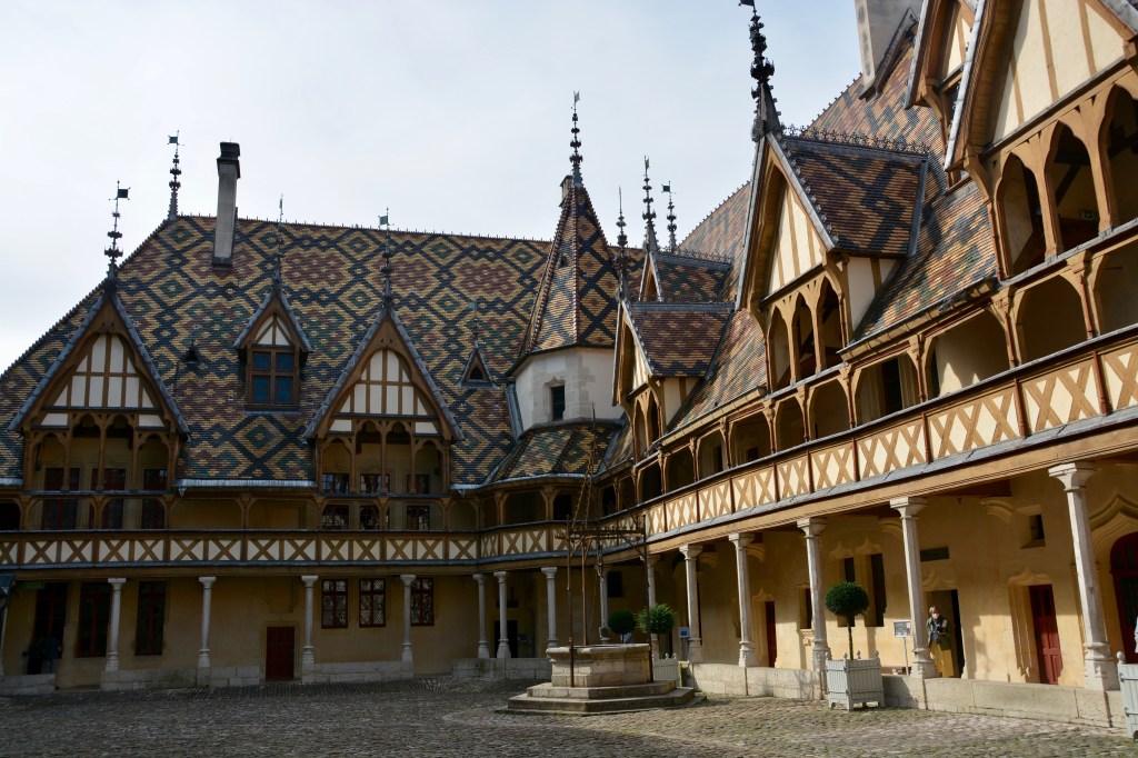 The façade is impressive, but once inside the courtyard you see what Beaune’s Hotel Dieu is perhaps best known for, its beautiful and colorful varnished tile roof. Oddly, the main building which is the oldest part of the structure has a slate roof in a uniform color. At that time in history, great wealth could be demonstrated by the quality of your roof and slate was considered the most expensive and therefore the most desirable material. We took some time to enjoy the courtyard and this wonderful setting. The polychrome roofs made for wonderful photographs, probably even better later in the day when hit by the full sun.