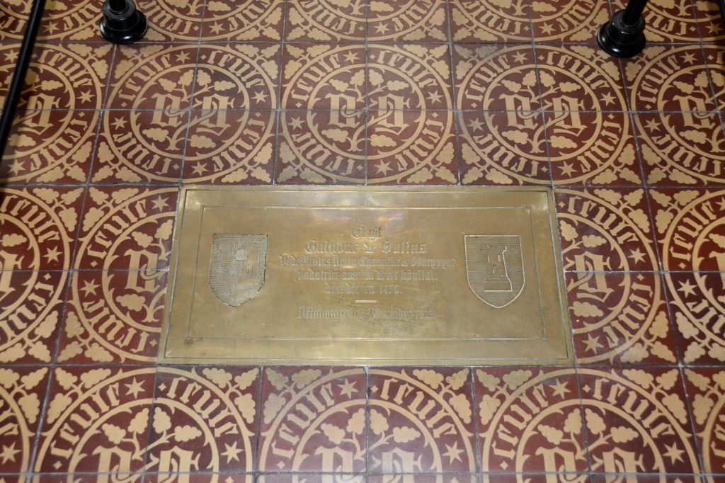 The main hall also has the carved heads and faces of local dignitaries next to a carving of an animal they resembled. Who would want to be placed next to the carved pig? The patients probably got a good laugh when they looked up. The hall’s chapel is also very lovely. The chancellor died first and was buried in the family crypt, but his wife, who found great joy and fulfillment at the hospital, asked to be buried in the Hotel Chapel. The tile floor, added later, features individual tiles in a design intertwining the initials of the founding couple.