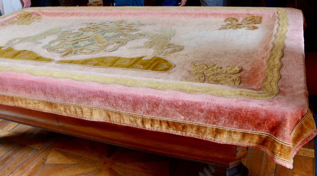 The opulence of the Great Hall of the Poor is striking and the poor who came here probably never experienced such luxury before. Outside of the hall, we toured more patient spaces, some richly decorated with fewer beds. We visited the Saint-Anne Room and the Saint-Hugh Room. The Saint-Nicolas Room where the straw model, medical objects, and costumes are displayed was closed to the public today. When the Sun King, Louis XIV, visited Beaune’s hotel Dieu, he was horrified that the men and women slept in the same room. He decreed they must be separated and thereafter the richly appointed spaces were reserved only for men.