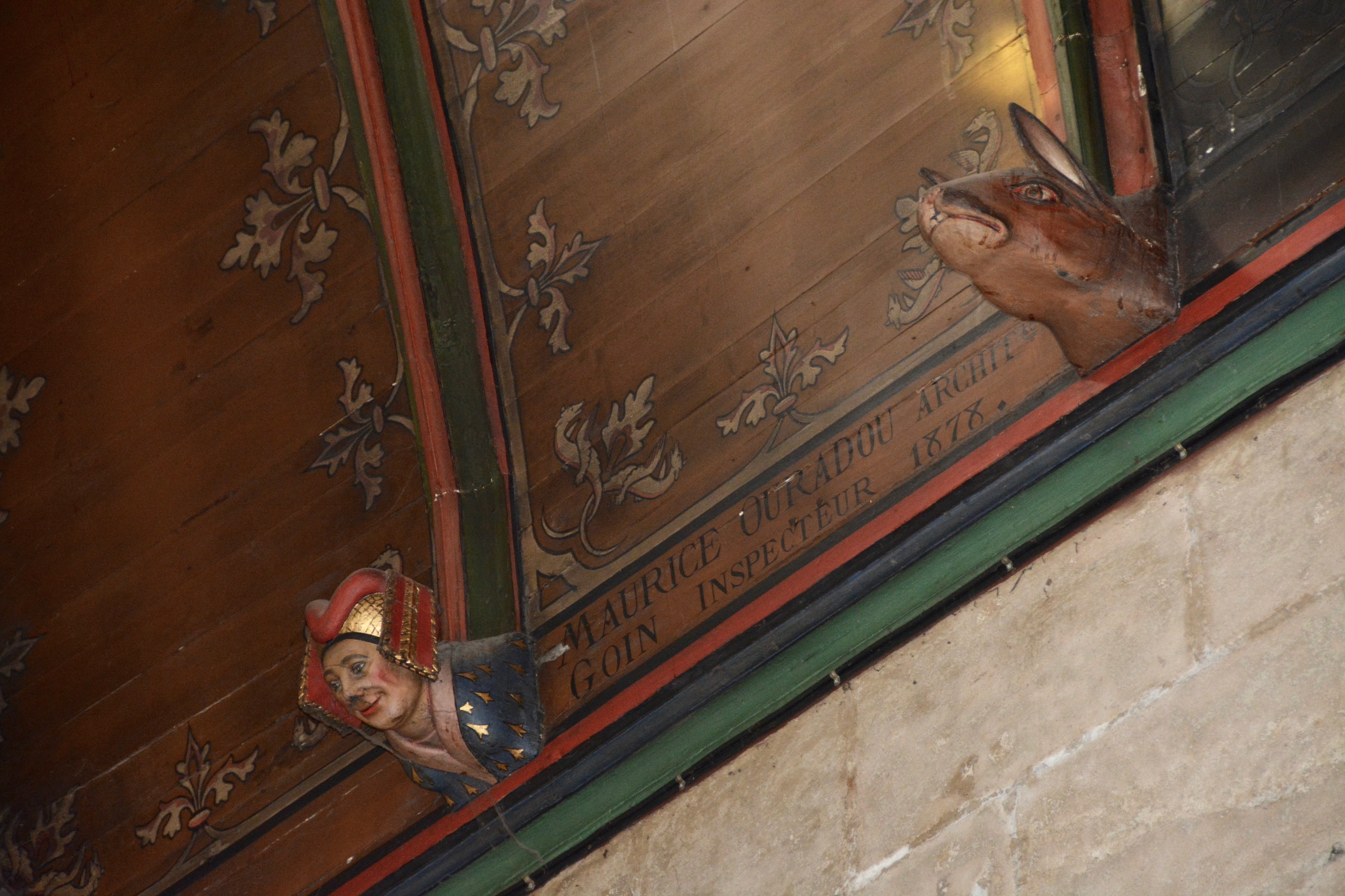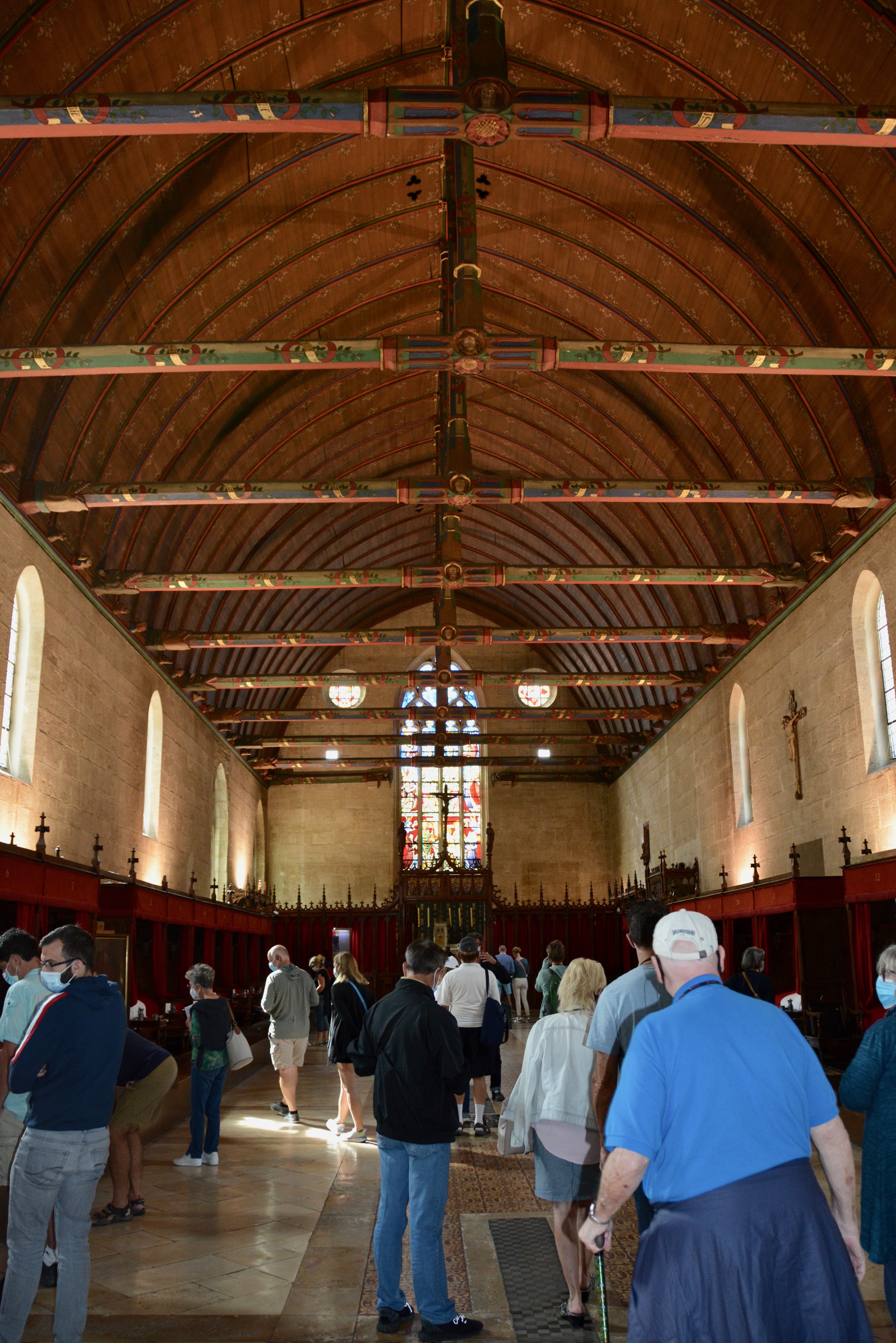 The main hall also has the carved heads and faces of local dignitaries next to a carving of an animal they resembled. Who would want to be placed next to the carved pig? The patients probably got a good laugh when they looked up. The hall’s chapel is also very lovely. The chancellor died first and was buried in the family crypt, but his wife, who found great joy and fulfillment at the hospital, asked to be buried in the Hotel Chapel. The tile floor, added later, features individual tiles in a design intertwining the initials of the founding couple.