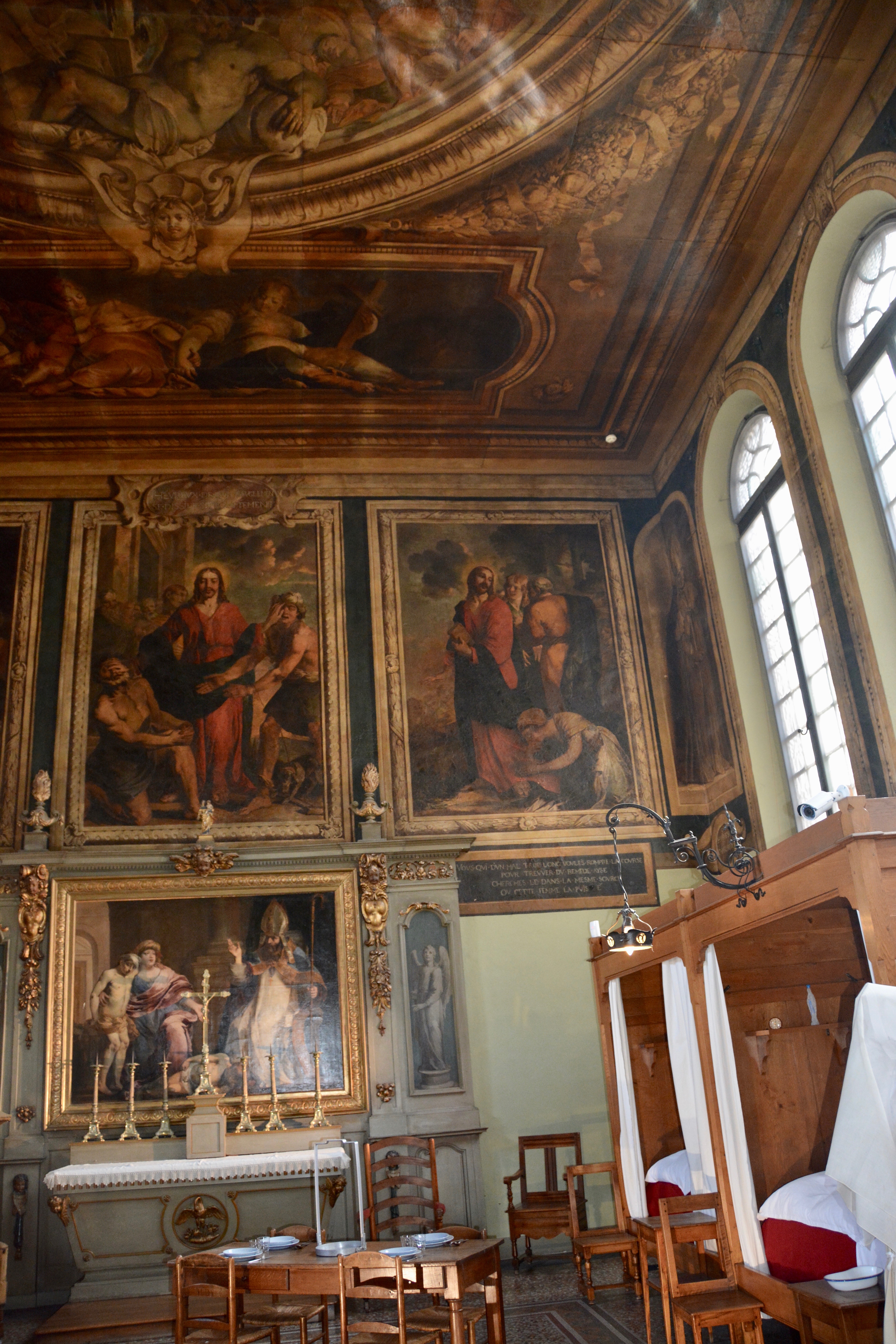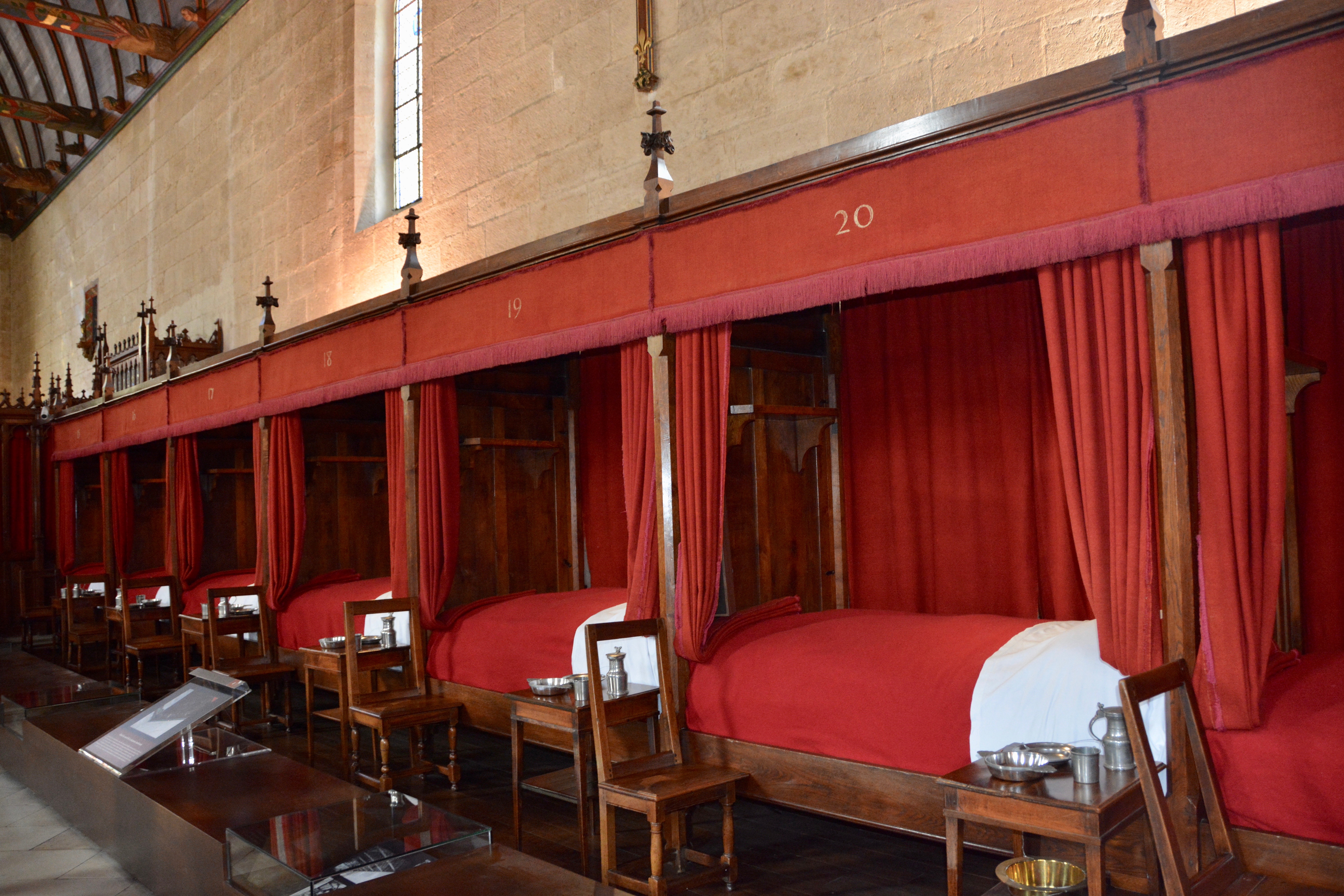 Next, we went inside the main hall with its 28 curtained beds lining the two long sides of the room. At the far end of The Great Hall of the Poor is the chapel. If they couldn’t restore your health, at least they could address your soul. The Great Hall is a huge space. Because of the foul air associated with illness, a large open space with windows was deemed best. Of course, this isolation was ruined by the fact that the beds were right next to each other and they put anywhere from 1-4 people in each bed. The large room was also very difficult to heat and never got above 60 degrees Fahrenheit in the winter so the patients would huddle together (and even closer to one experiencing fever) and then close their curtains further confining the germs.