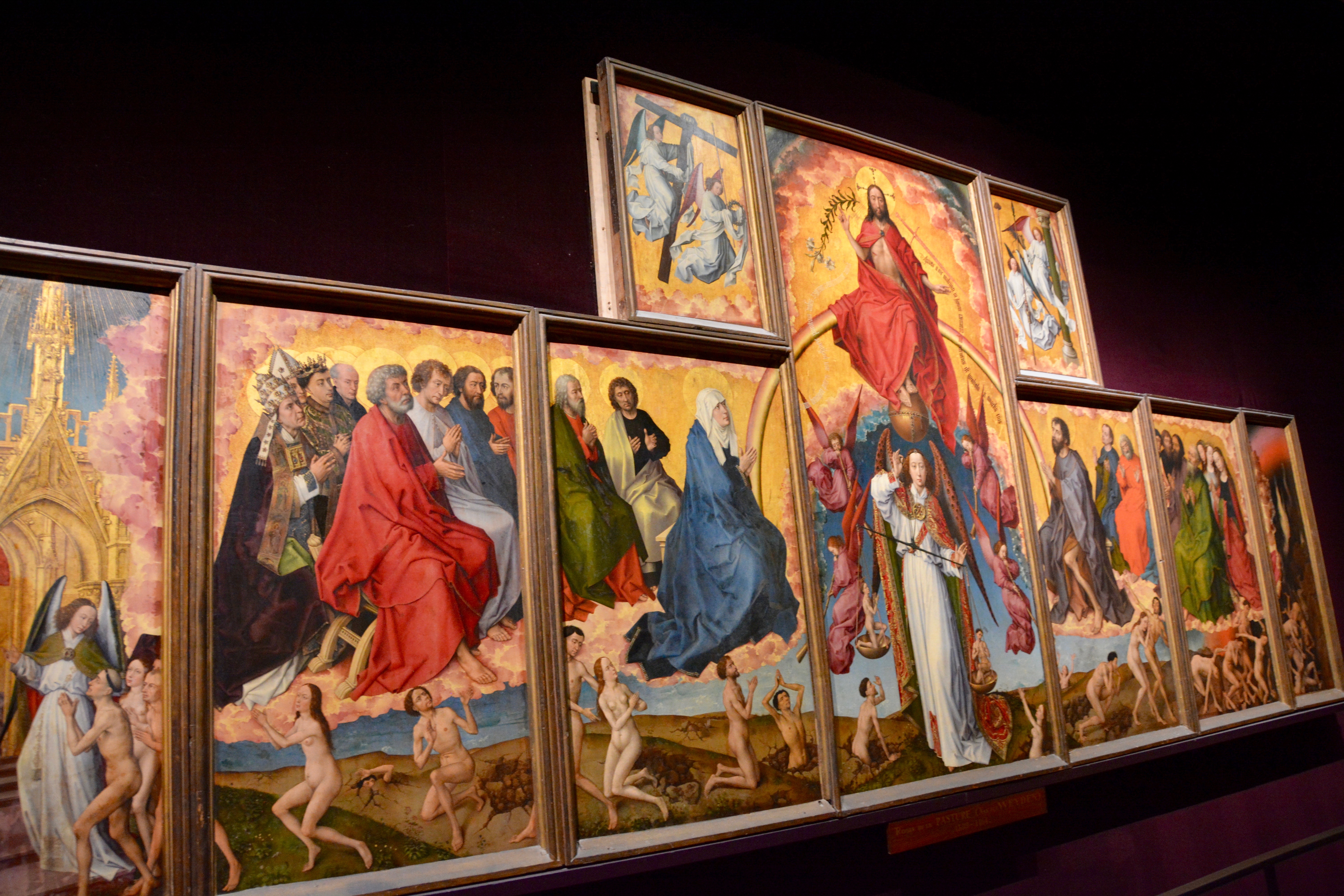 Our final stop in the Hotel Dieu was through the Saint-Louis Room to see the altar screen that the chancellor and his wife commissioned from Flemish artist Rogier Van der Weyden to adorn the chapel. The polyptych of the Last Judgement is housed in a separate, temperature-controlled room. In the closed position, the screen is mostly in black and white, but when opened (as it was on Sundays) a very colorful scene of the Last Judgment was revealed. As a judged soul, you definitely wanted to be headed to the left side and the beautiful golden castle, rather than the fiery right side.