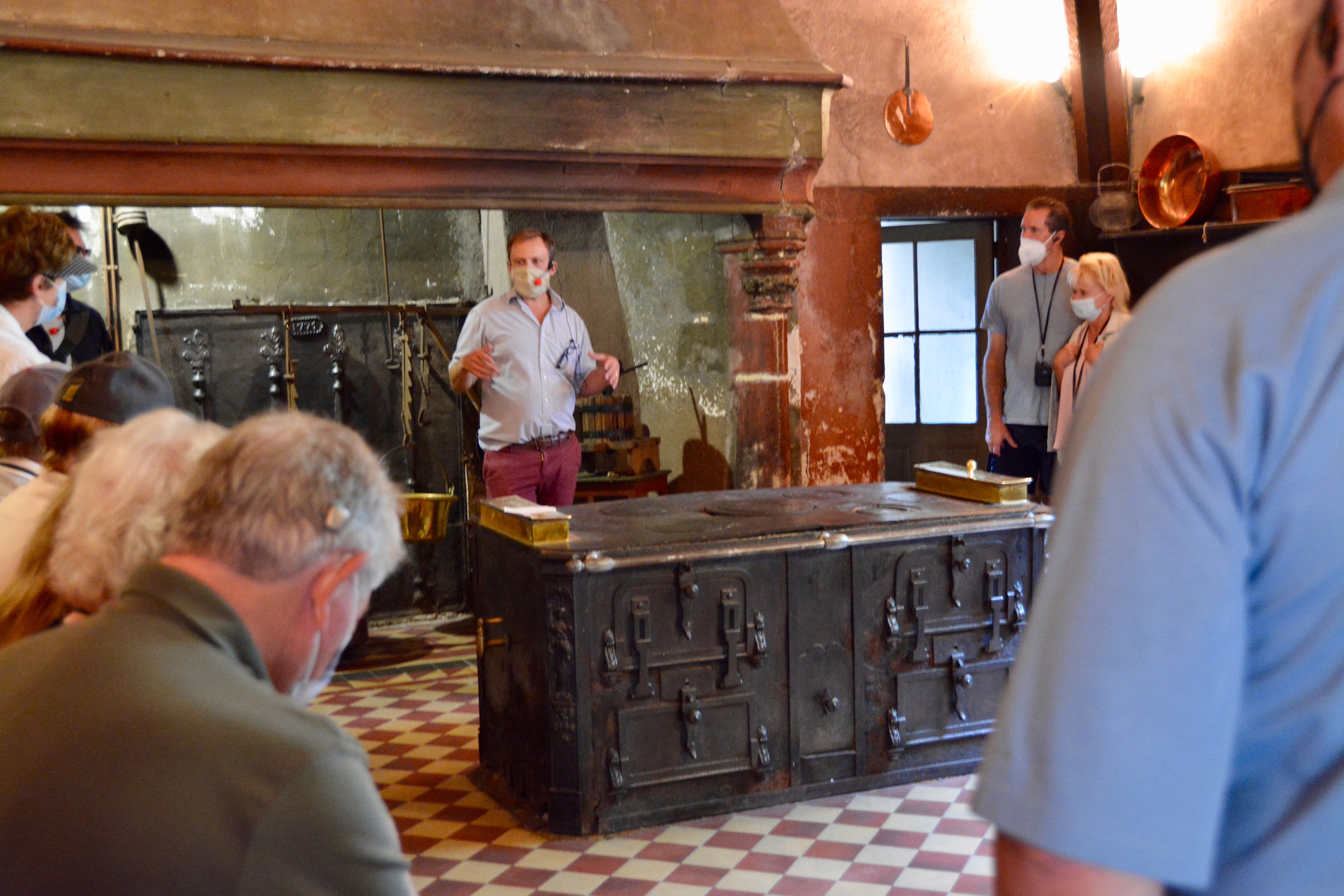 The last stop on the tour was the chateau’s kitchen that was part of the original structure. The kitchen was last renovated in the 1800s when a new tile floor was installed and an oven made its first appearance. This was still the only kitchen in use when the Count was a boy. Today they have a modern kitchen. The Count said the castle does have a cellar, but he has no idea where to access it. He suspects that the trapdoor is under the kitchen’s tile floor.