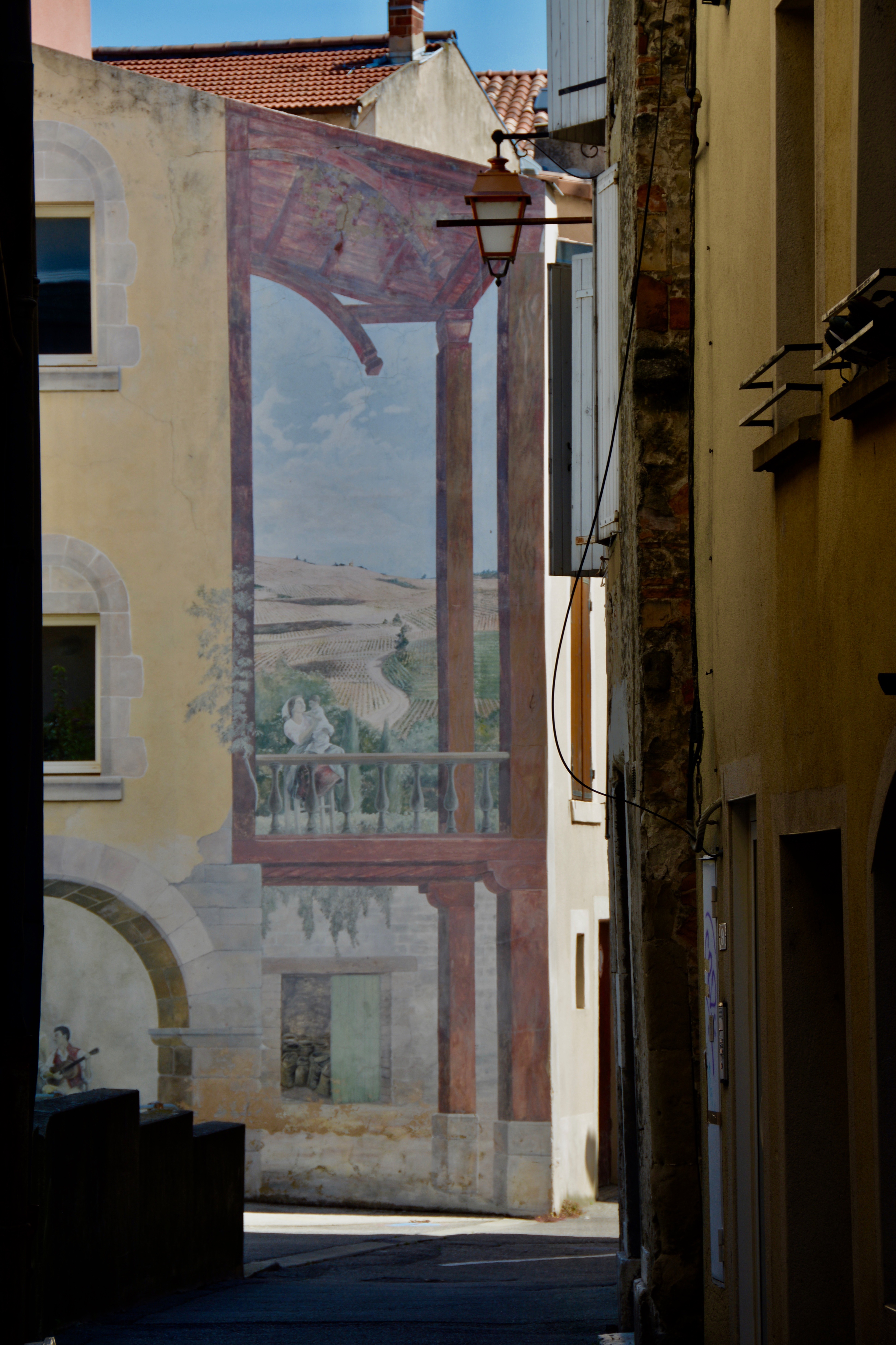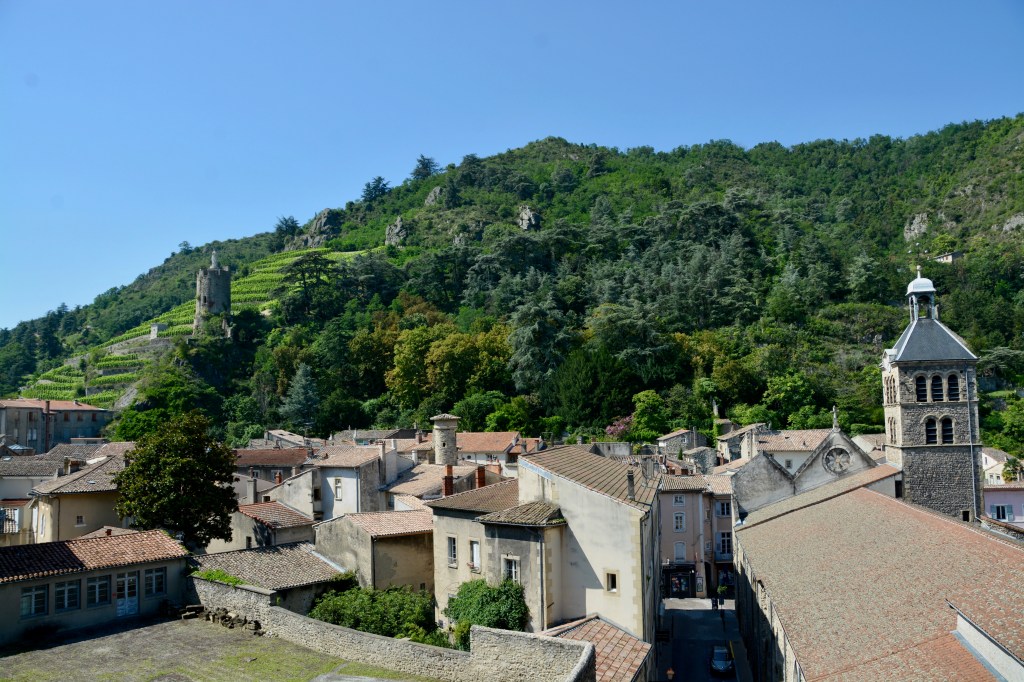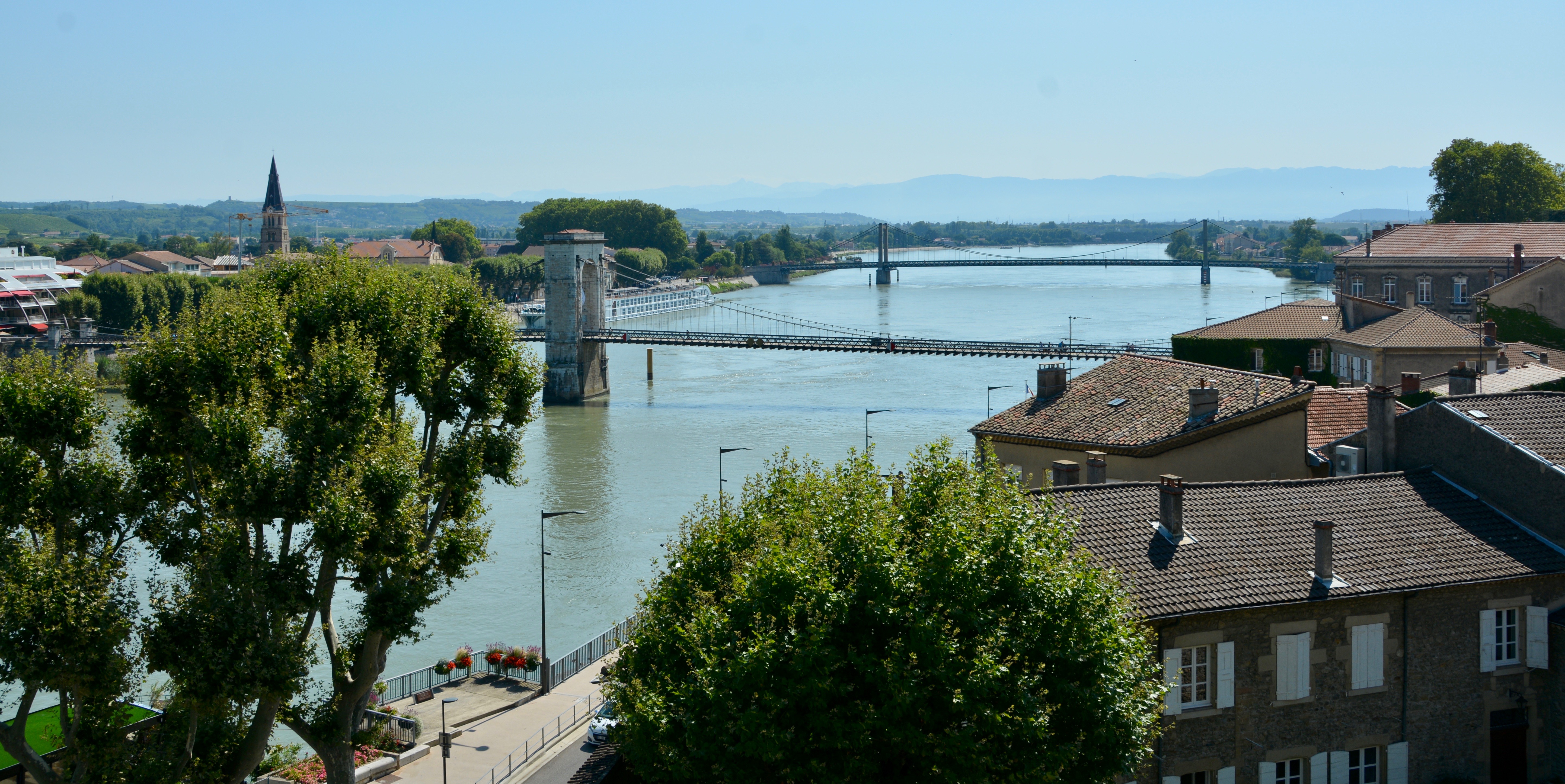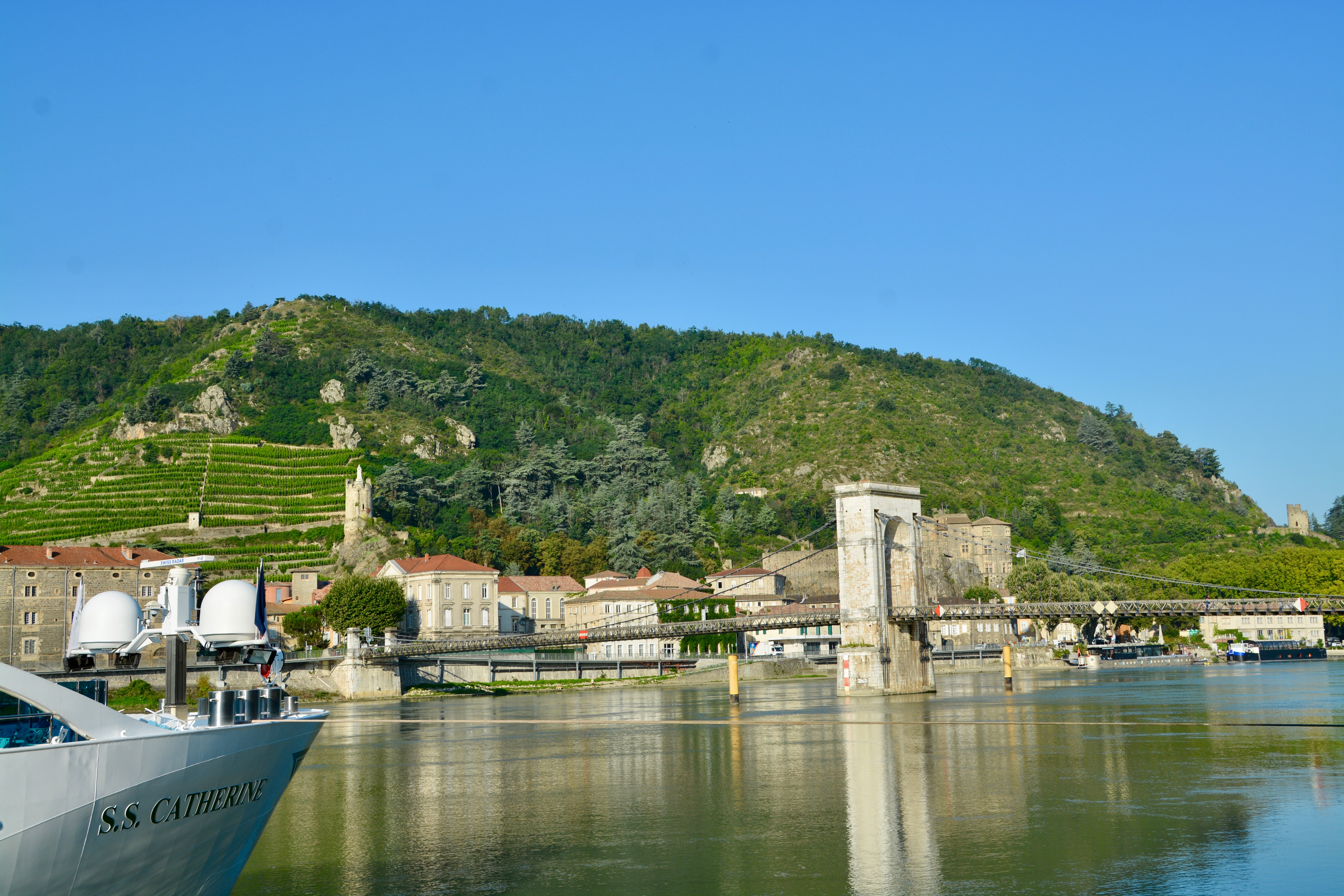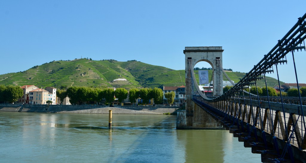 After winding through the picturesque streets, we found ourselves at the city’s administrative building. To the side was the entrance to the tower ruins. We are having a reception on the Castle Museum terrace and enjoying some of the wines from a regional producer. There was a white and two reds to sample. Syrah grapes are the ones used to produce the more plentiful red wines in the region. None of the selections overly impressed me, but I loved the fabulous views of the twin cities, the Rhone and the Hermitage Hill on the opposite side of the river. It was very hot and luckily there was some shade. Some of the ship’s guests hiked through the vineyards on Hermitage Hill as an alternate excursion. A select few chose the masterpiece tour and had a tasting at a local winery.