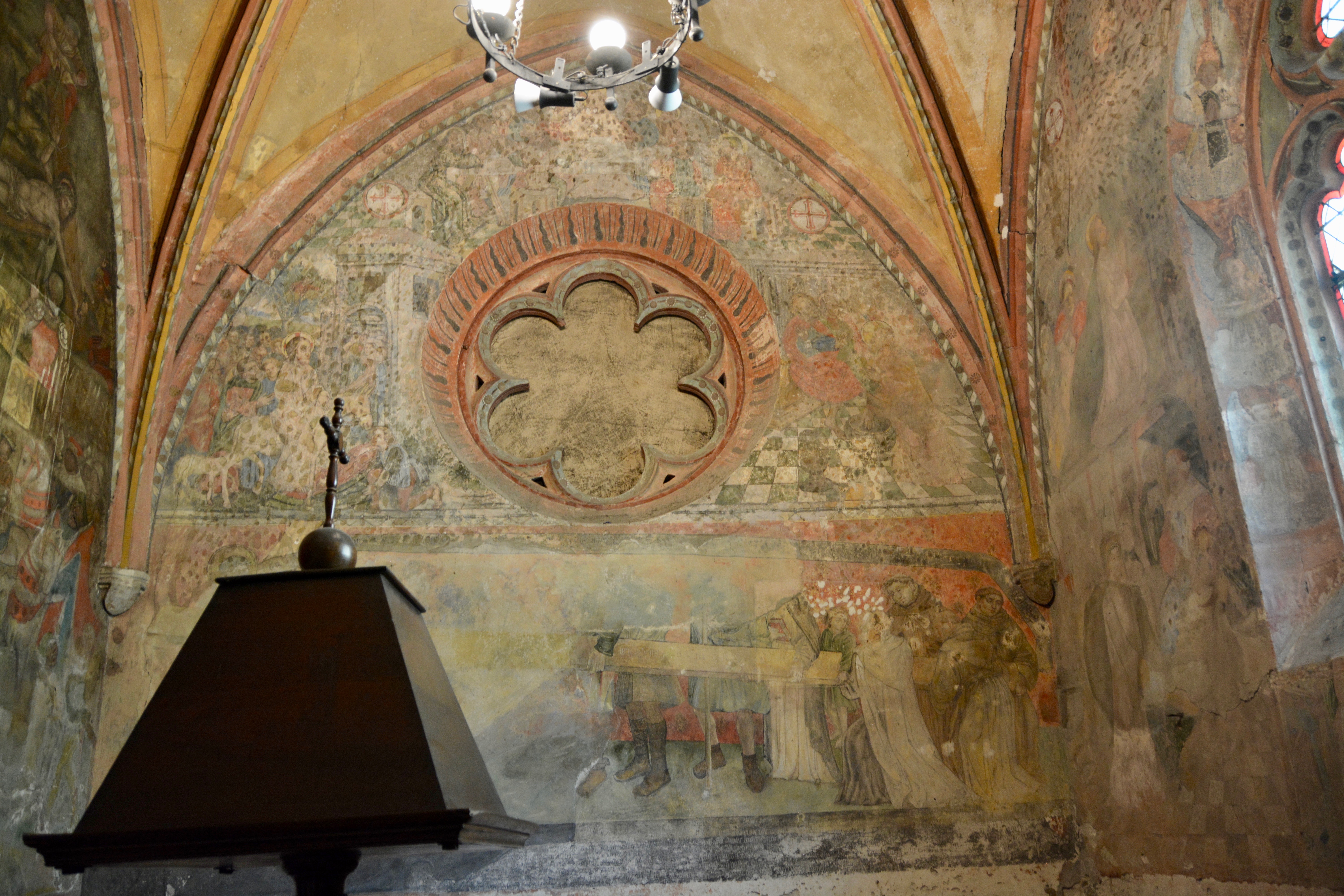 Winding through town we stopped at a unique church built into the rock. It has been heavily damaged. The rose window frame is in place, but it is empty and behind the façade the church is shaped like a box. At one point the church was so in debt that it sold off its chapels. Along one street, a house and the church share a wall and the owner has a washing line hung attached to the church. On the side street, the spaces where there would have been chapels are now businesses that open to the exterior, rather than the interior of the church. One was a pizza place. Inside the church, the ceiling has been replaced with one made from the local chestnut wood, so the whole interior is very dark. On the right side is an alcove adorned in candles, on the left is a remaining side chapel which is decorated with wonderful medieval frescos. The rest of the left side wall is smooth due to the sold off chapels.