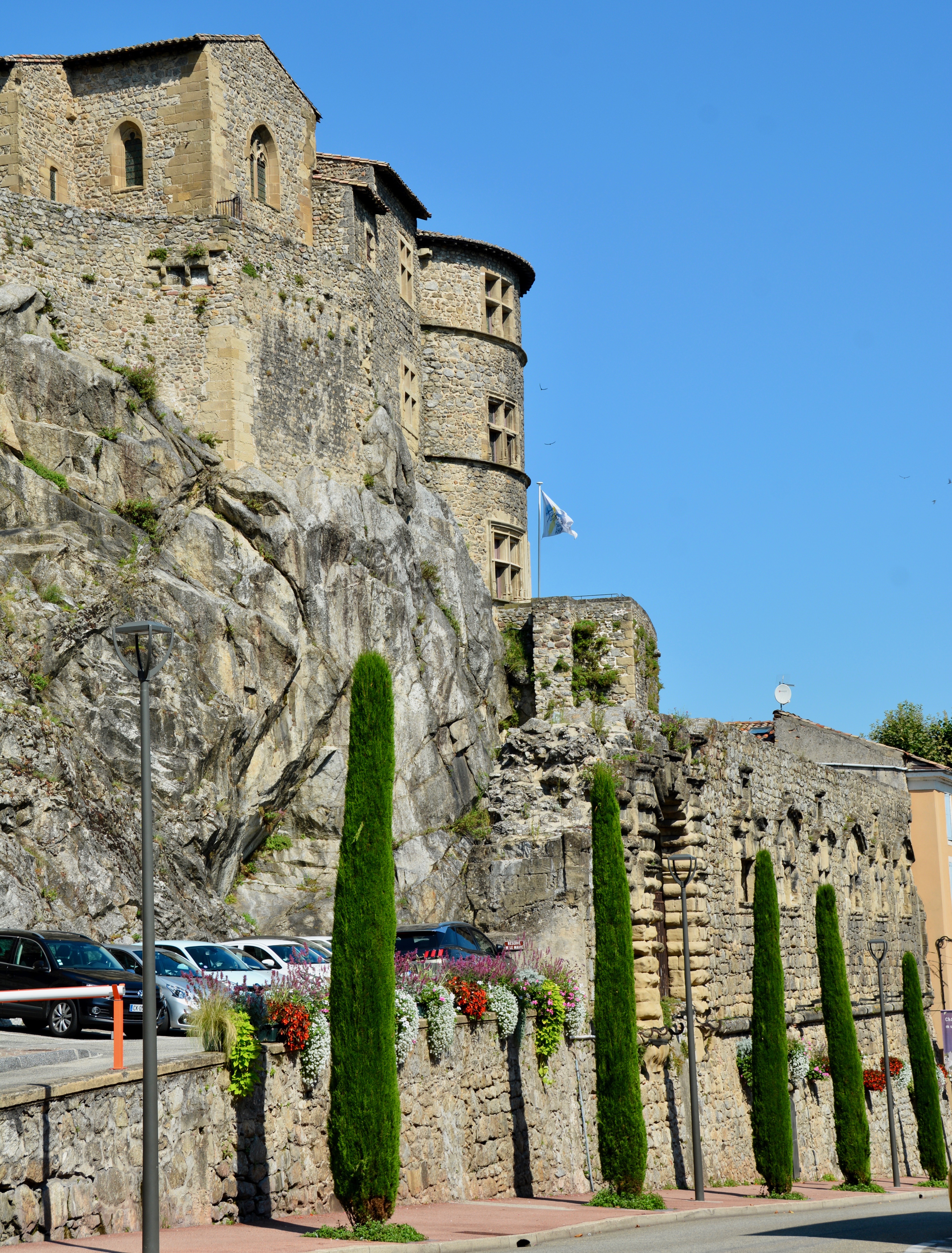 Jeanette led us across the attractive, wooden-floored, pedestrian bridge that links the towns of Tain and Tournon. Tain L’ Hermitage is on the more affluent side of the river which has the benefit of the hill and vineyards. Tournon, our destination, is on the other side of the Rhone in one of the poorest counties in France. We started our Tournon tour with the stop along the river with a marker recognizing the engineer Marc Sequin who constructed the first suspension bridge over the Rhone in 1825. Across the street at the base of rock is an impressive war memorial. It was not unusual for poorer counties to see many more of their boys sent to the front lines, and the losses were often heavy. The memorial is set against the stone mount upon which the Castle Museum set in the tower ruins sits.