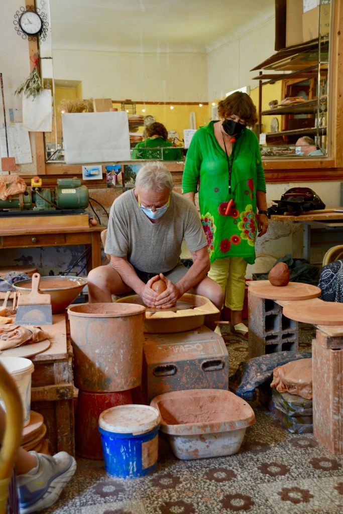 Making our way back down into the lower city, we picked up Boris and headed to our personalized activities. Two of the groups are going into the homes of their guides who live in medieval Vivers. Since Jeanette lives outside the city, our group is going to see a local potter in action. He made both a salad bowl and vase while we observed him at his wheel. He starts with a red clay.
