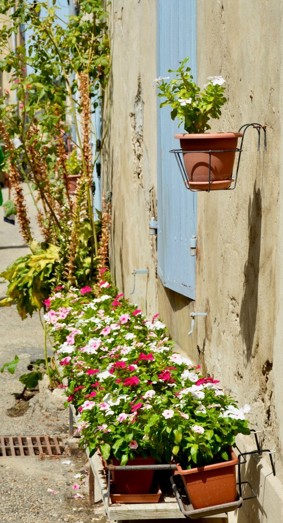 There is a bit of an uphill trek associated with our tour of Viviers and I can already see Boris starting to consider opting out. He is having to use a cane on this trip and between the heat and the incline (which we are not used to coming from flat Houston, Texas) it has been a struggle for him. Viviers is also mostly cobblestones. At some point, Boris decided to rest in a square with a charmingly painted home beside him.