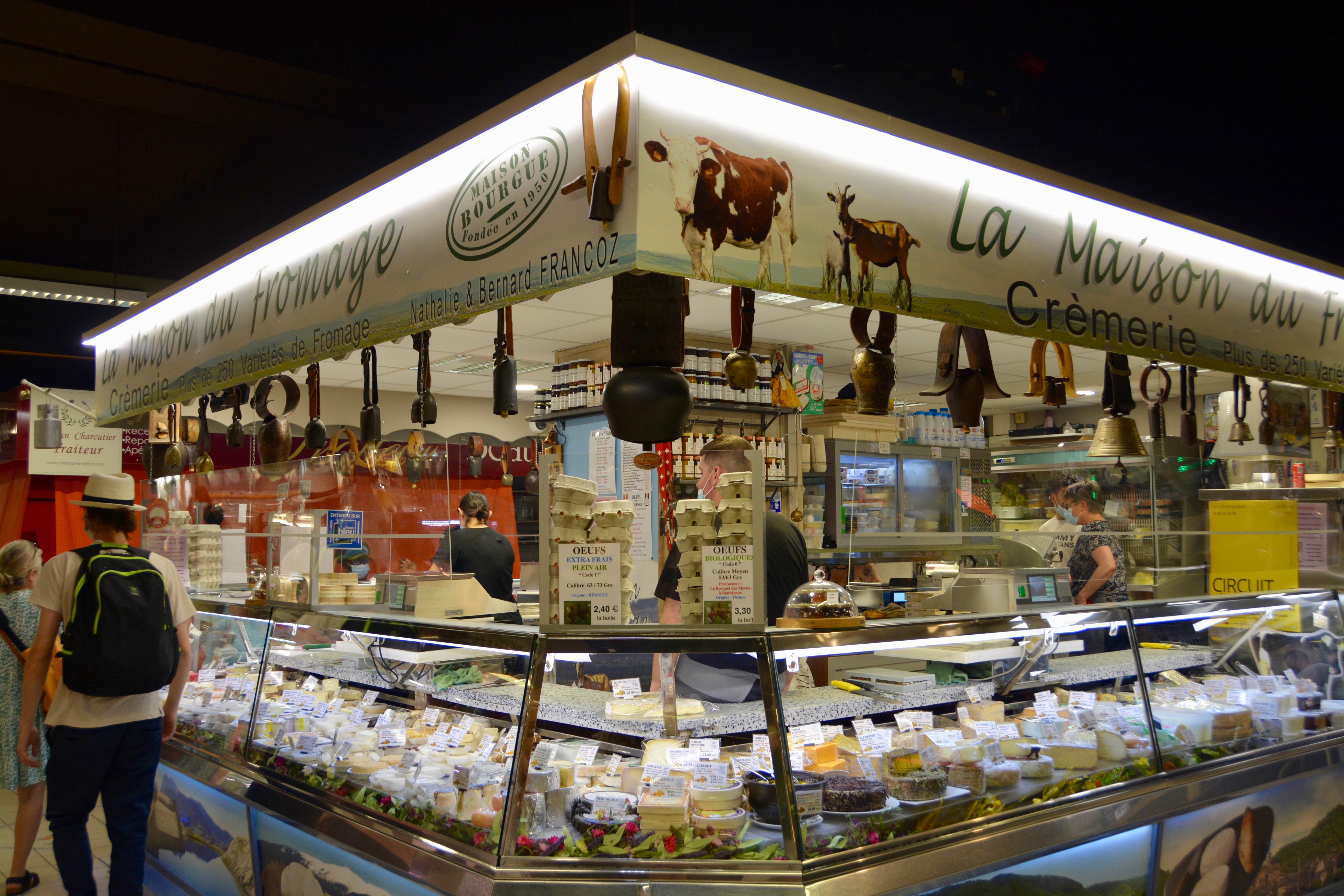 After our Palace tour, we ventured a little farther into the walled city. There are some wonderful shops and the city is quite charming, but the day had grown incredibly hot. I was happy when I realized our next destination, Les Halles, was air conditioned. Les Halles is a wonderful enclosed market with meat and seafood vendors, vegetable and fruit stands, cheese shops, and so much more. Our guide recommended the oyster bar at the far end, but it was closed today (the proprietors were probably on their own annual holiday).