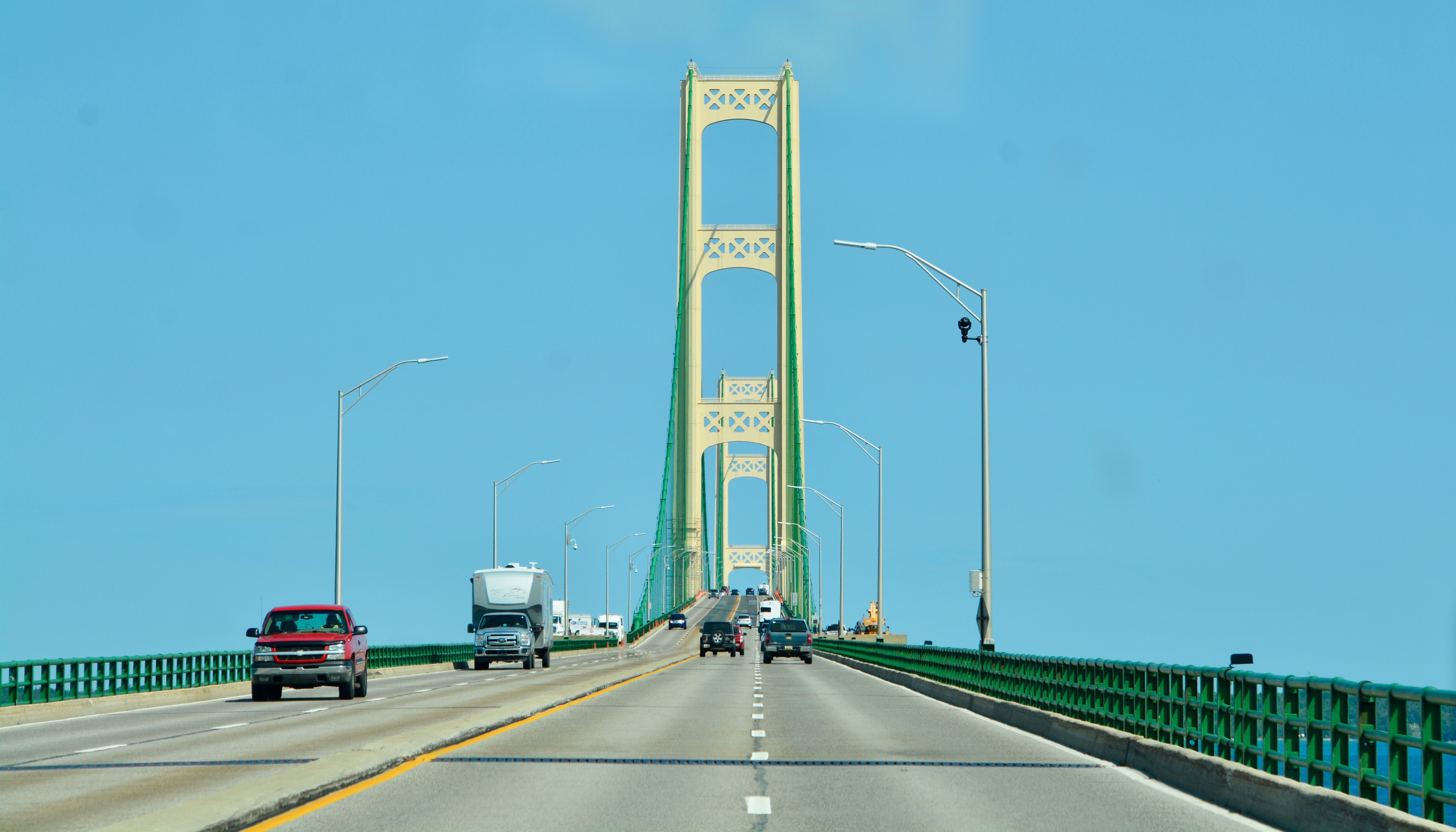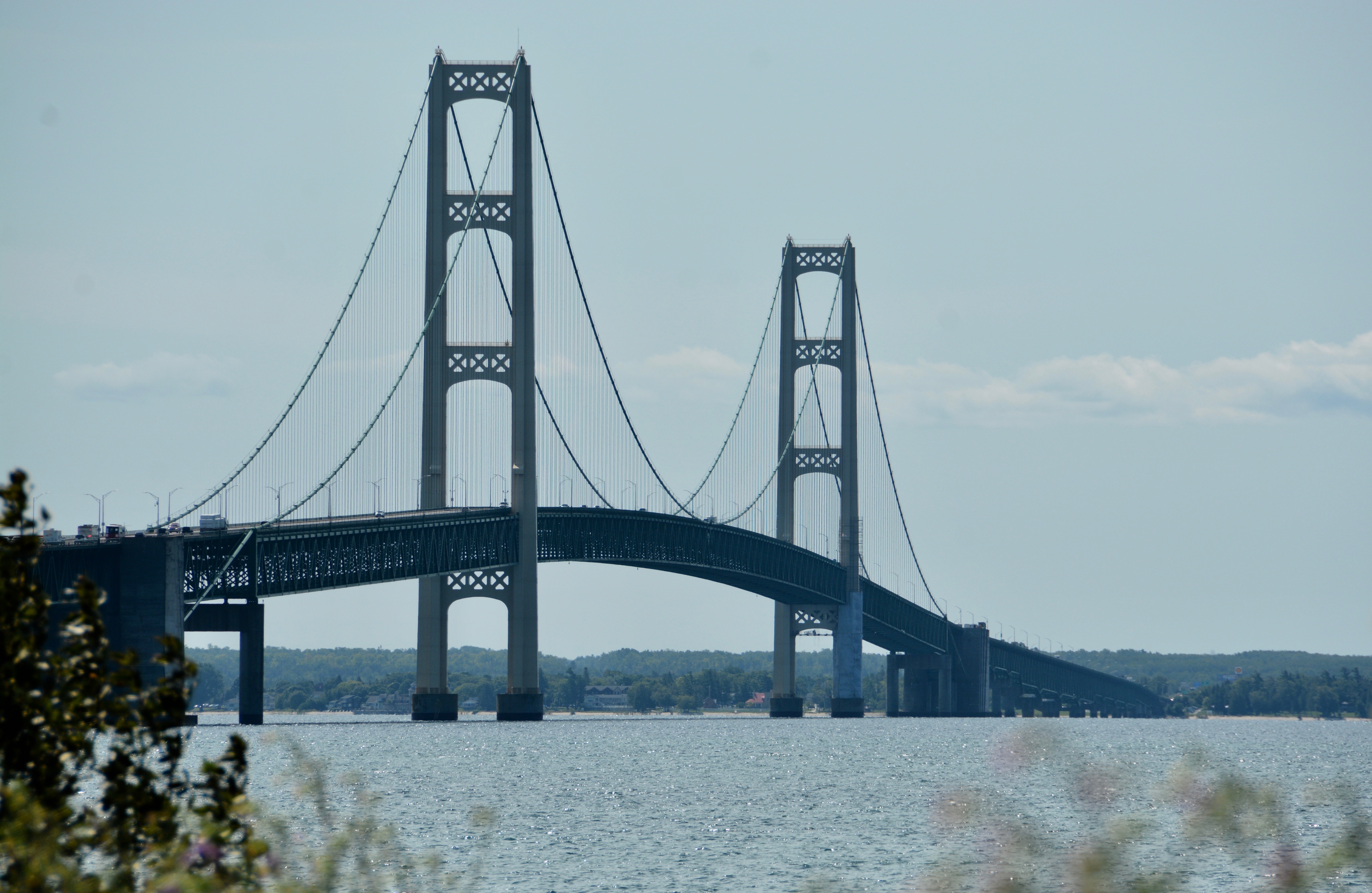The Mackinac Bridge is the 5th longest suspension bridge in the world and the longest in the western hemisphere. Like all suspension bridges, “it is designed to move to accommodate wind, change in temperature, and weight…the deck at center span could move as much as 35 feet (east or west) due to high winds. This would only happen under severe wind conditions. The deck would not swing or ‘sway’ but rather move slowly in one direction based on the force and direction of the wind. After the wind subsides, the weight of the vehicles crossing would slowly move it back into center position.” Mackinac Bridge Authority