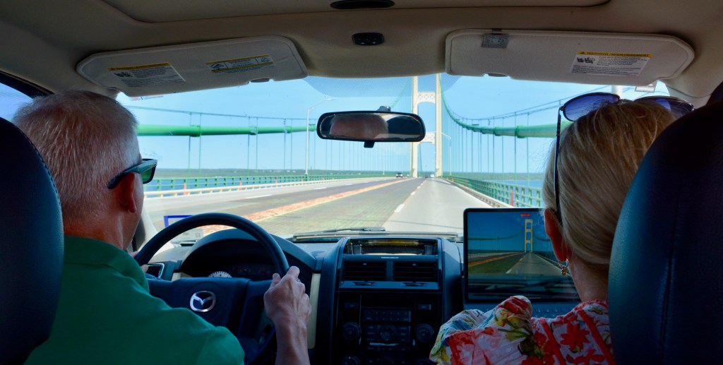 The upper and lower peninsulas of Michigan are joining by the Mackinac Bridge, a long beautiful structure that is sometimes shown as the symbol for the state. My sister Emma hates crossing bridges, especially when driving or sitting on the side facing the open area outside the bridge. Since my mother had decided to “nest” in the seat behind the driver, my brother Jack, Emma was in the outside position sitting next to the driver. She decided to film the bridge crossing as a distraction. There are multiple lanes crossing in each direction but the inner lanes have annoying ridges that can cause you to slide a little. (This is rather ironic given the purpose of the grooves is to assist in poor weather.) We were traveling in the outside lane, with Emma and I closest to the water.
