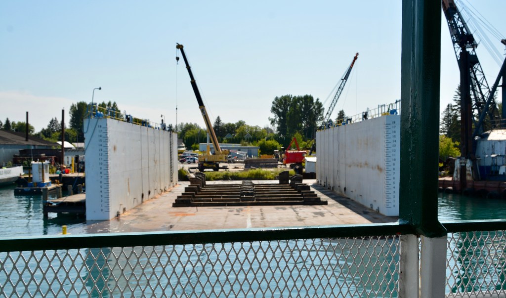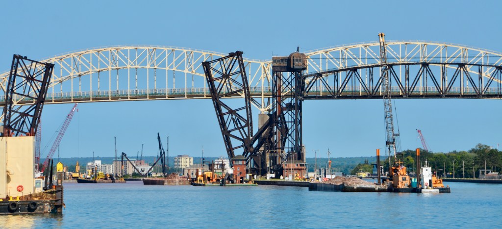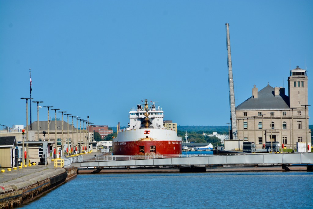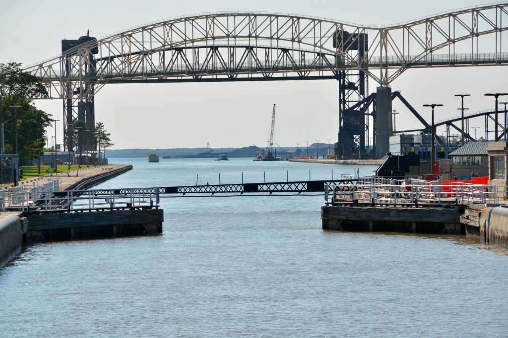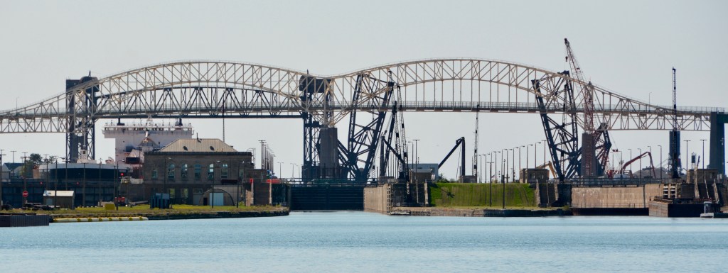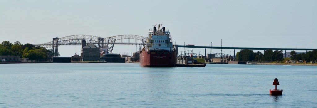 Both of the Davis and Sabin locks are currently being dismantled to make way for a new, larger, single lock that will be able to accommodate ships of a larger size. We saw the dredging for the new lock. Completion is expected in 2023. A rendering of the new look for the Soo Locks is on the webpage for the Army Corps of Engineers. The importance of the locks cannot be overstated. 90% of the country’s iron ore passes through the Soo Locks. The existence of the locks means transport ships can travel from Duluth, Minnesota to the Atlantic Ocean. The trip takes 7 days.