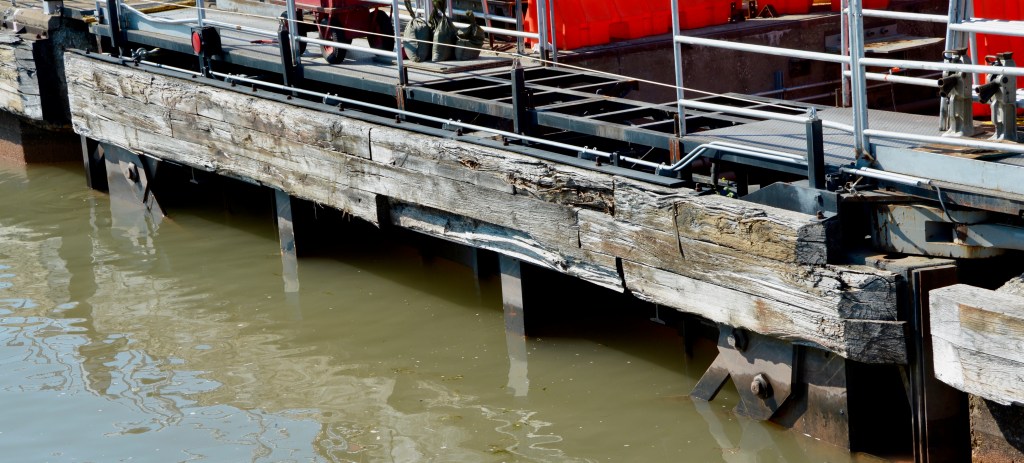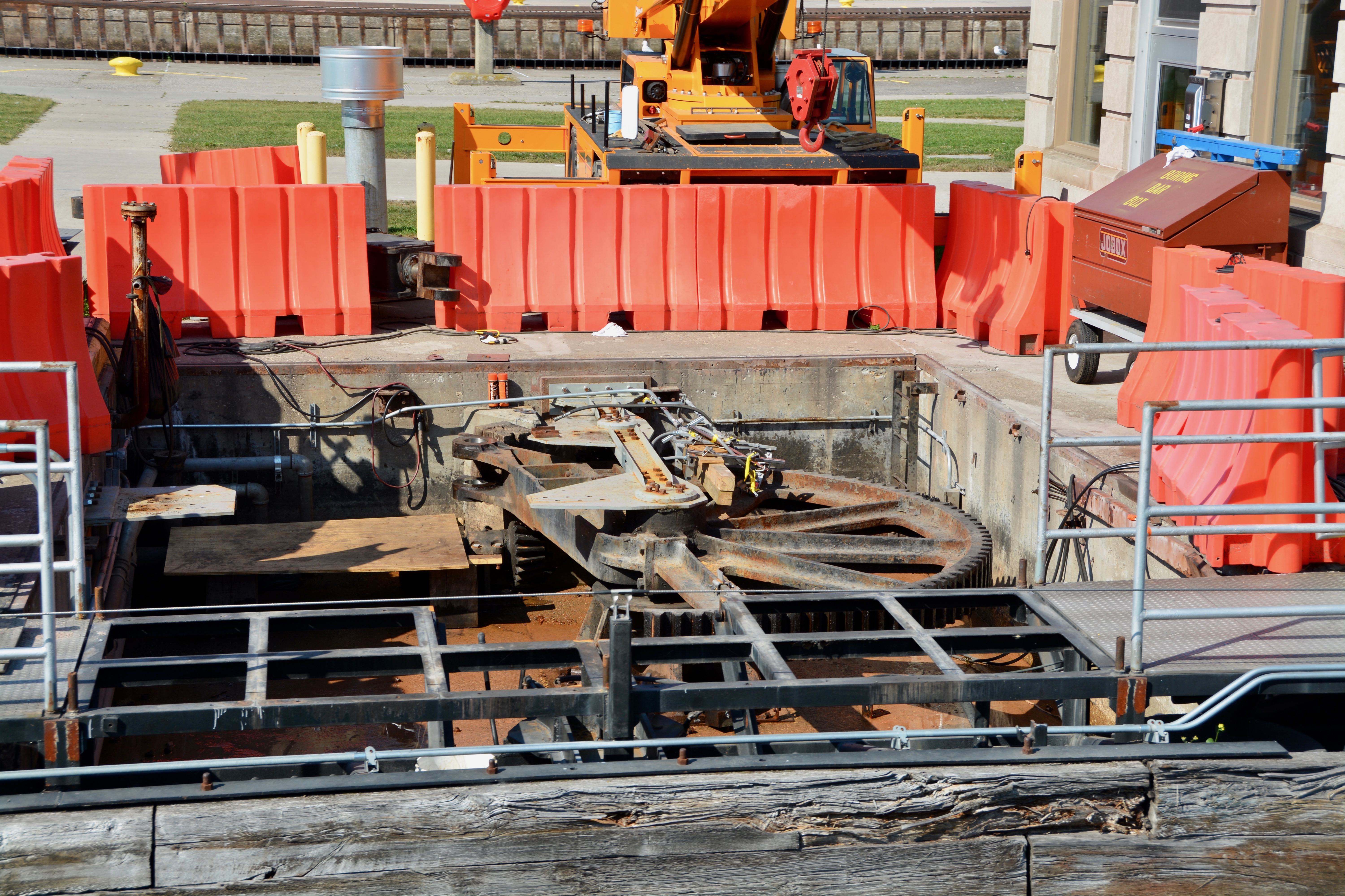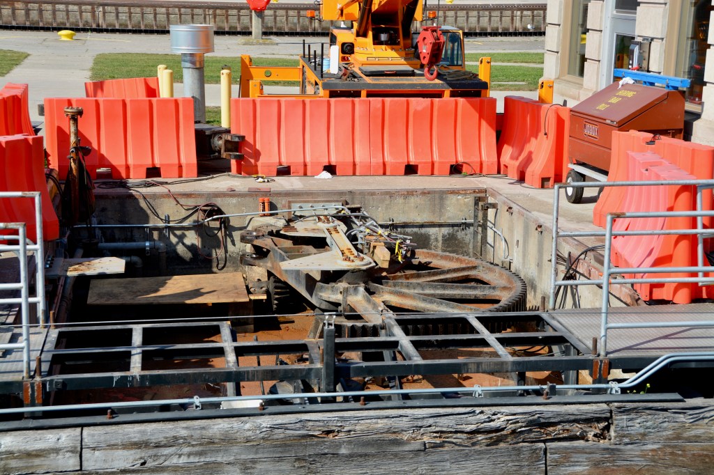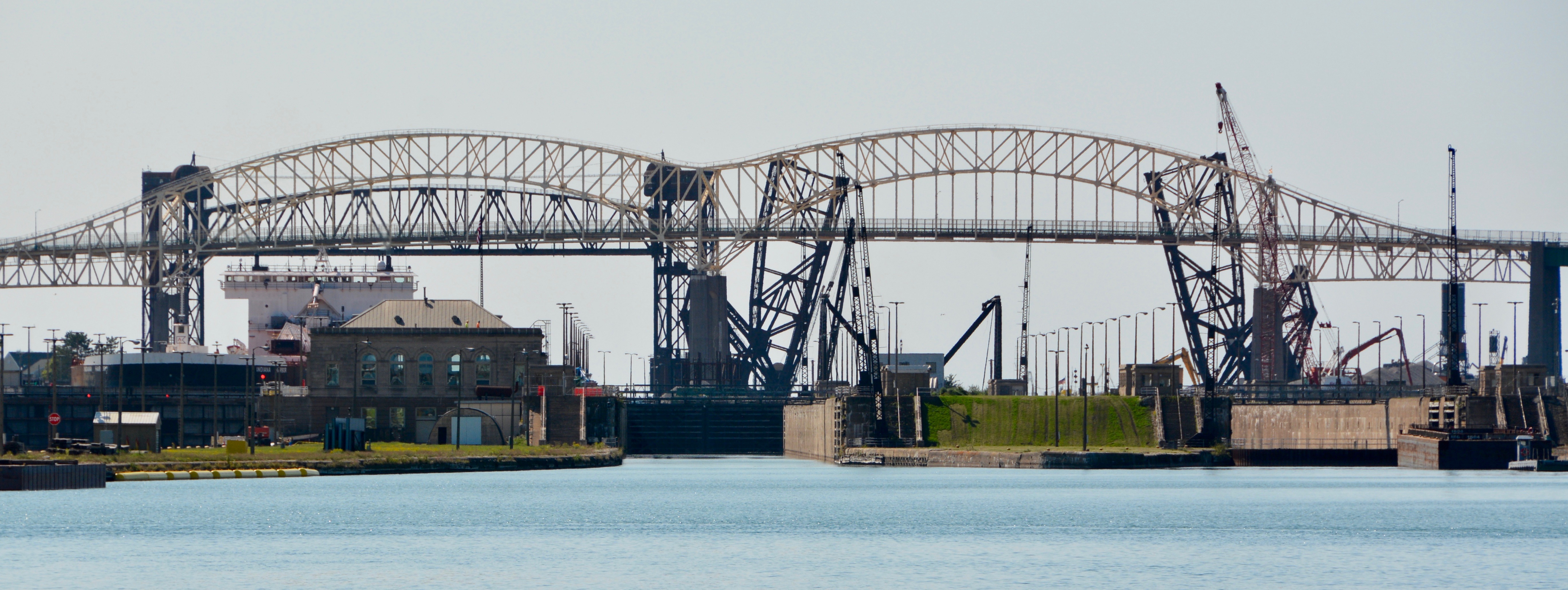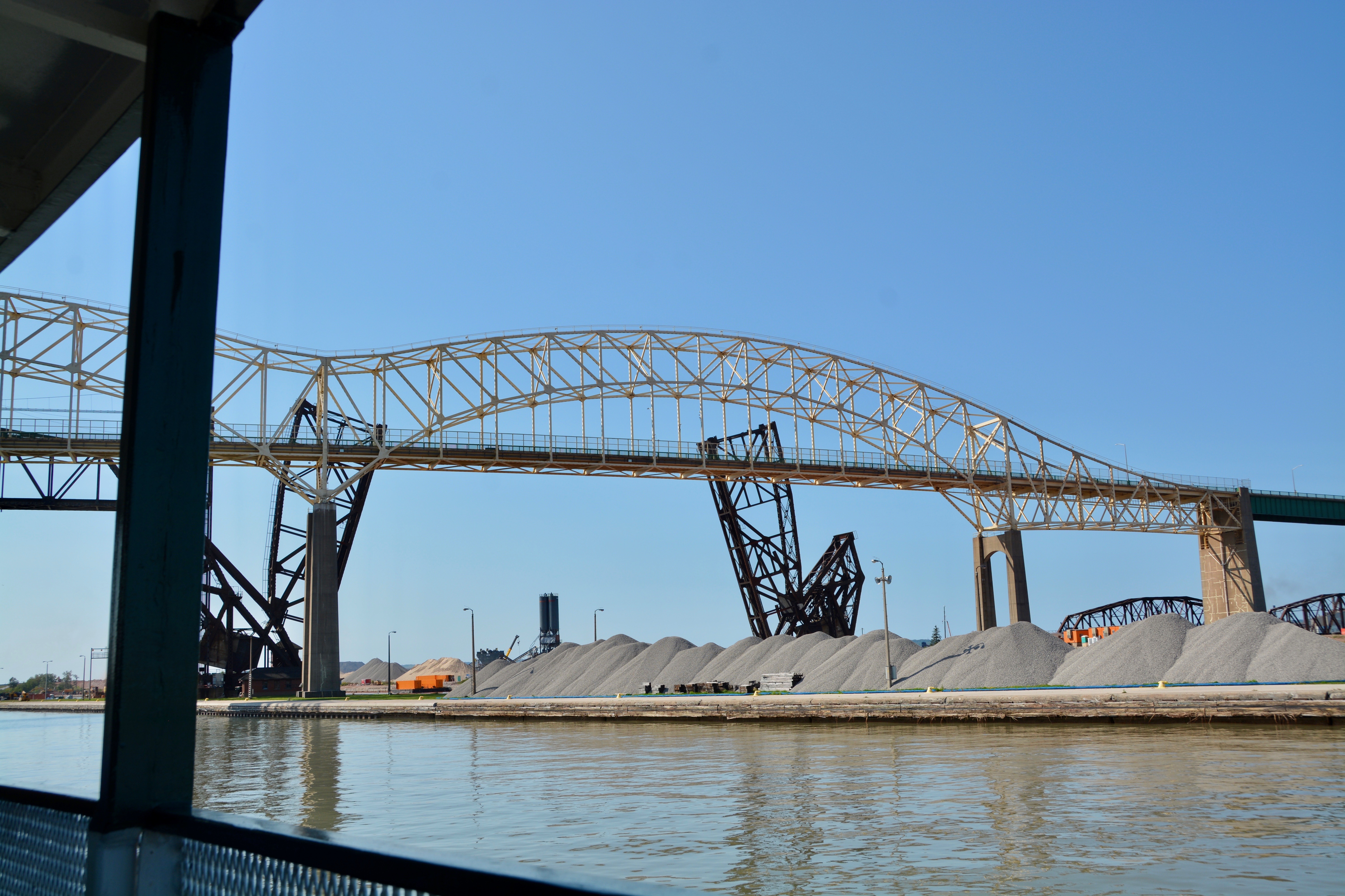 When we were high enough, the gates opened on the opposite end and we headed out to pass underneath the International Bridge. Due to ongoing repairs, a cover had been removed and we were able to get a look at some of the gears that work the locks. We could also see the decay that betrays the age of these long-working structures. As we passed by the opening to the Poe Lock next to us, we could see the freighter inside. On the walkway between the Poe and the MacArthur, supports that will be used to secured the locks during the winter months had already been set out. The Soo Locks are closed from January 15 to March 25 for repairs.