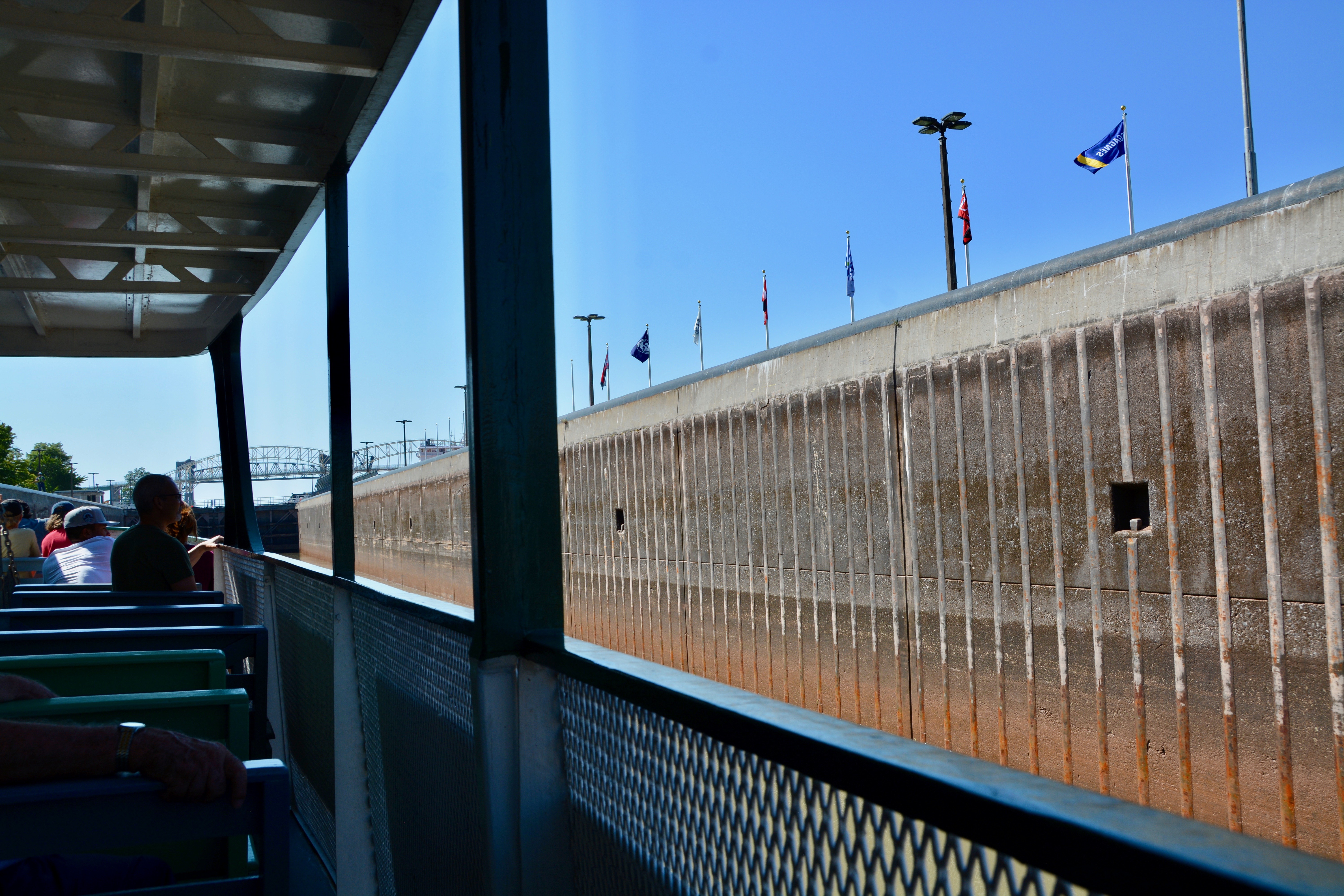 This side of the St. Mary’s River is the lower level so we entered the lock at a depth of 33 feet. The crew threw anchor lines up to the shore to attach us to the side. Hooks to tie off on were also visible on the concrete sides of the lock. I thought the locks were smooth, but you could see the ridges in the concrete as we entered. There was also a large freighter in the Poe Lock next to us. The water rose so smoothly if you weren’t watching the sides you wouldn’t even notice you were going up. The locks do not use pumps, but are activated by gravity.