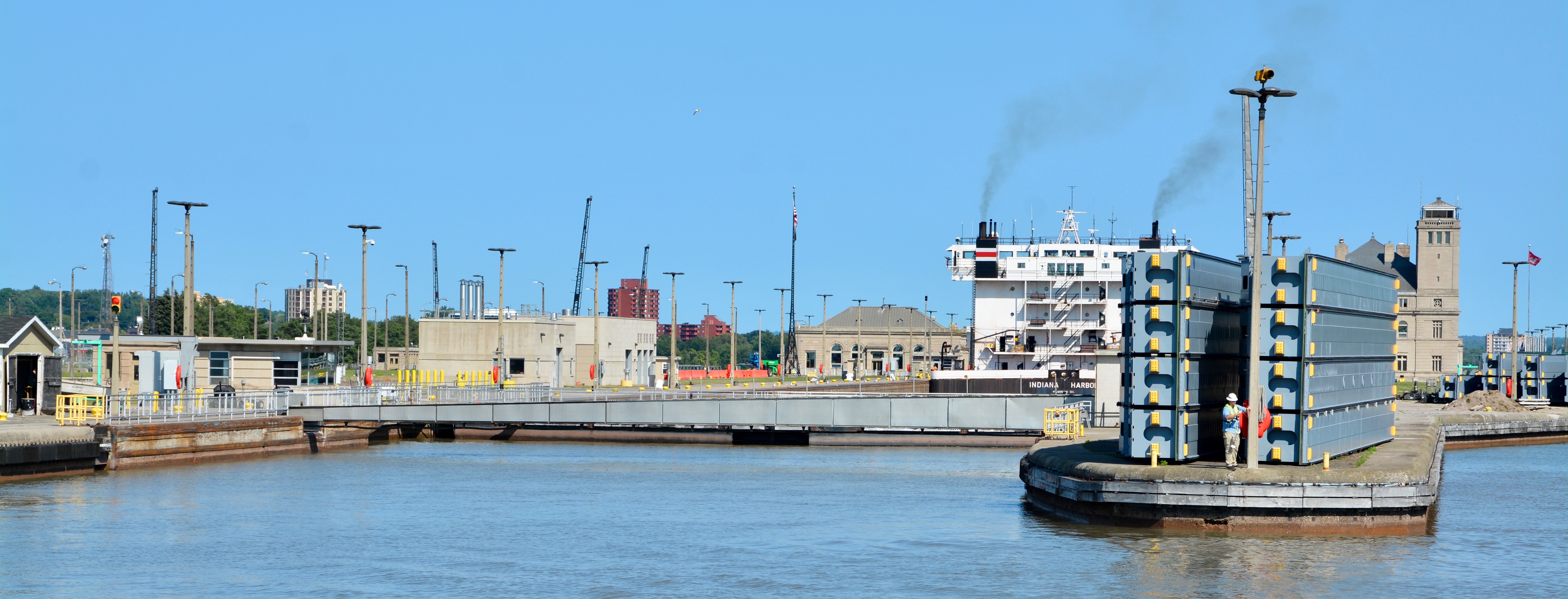 We are on the St. Mary’s River between the United States and Canada and the middle of this channel is the international border. The Ojibway Indians used canoes to travel the rapids on the river to reach Lake Superior. The name of city comes from the French word sault meaning rapids. You can still still some evidence of the original rapids which spread the length of the River. Later, it was the Northwest Fur Company that constructed a navigation lock on the Canadian side of the river. This lock, built in 1797, was destroyed during the war of 1812. In 1852, the State of Michigan was granted compensation to built a lock to allow for commerce to flow through the Great Lakes. Construction on this first chamber State Lock was completed in 1855.