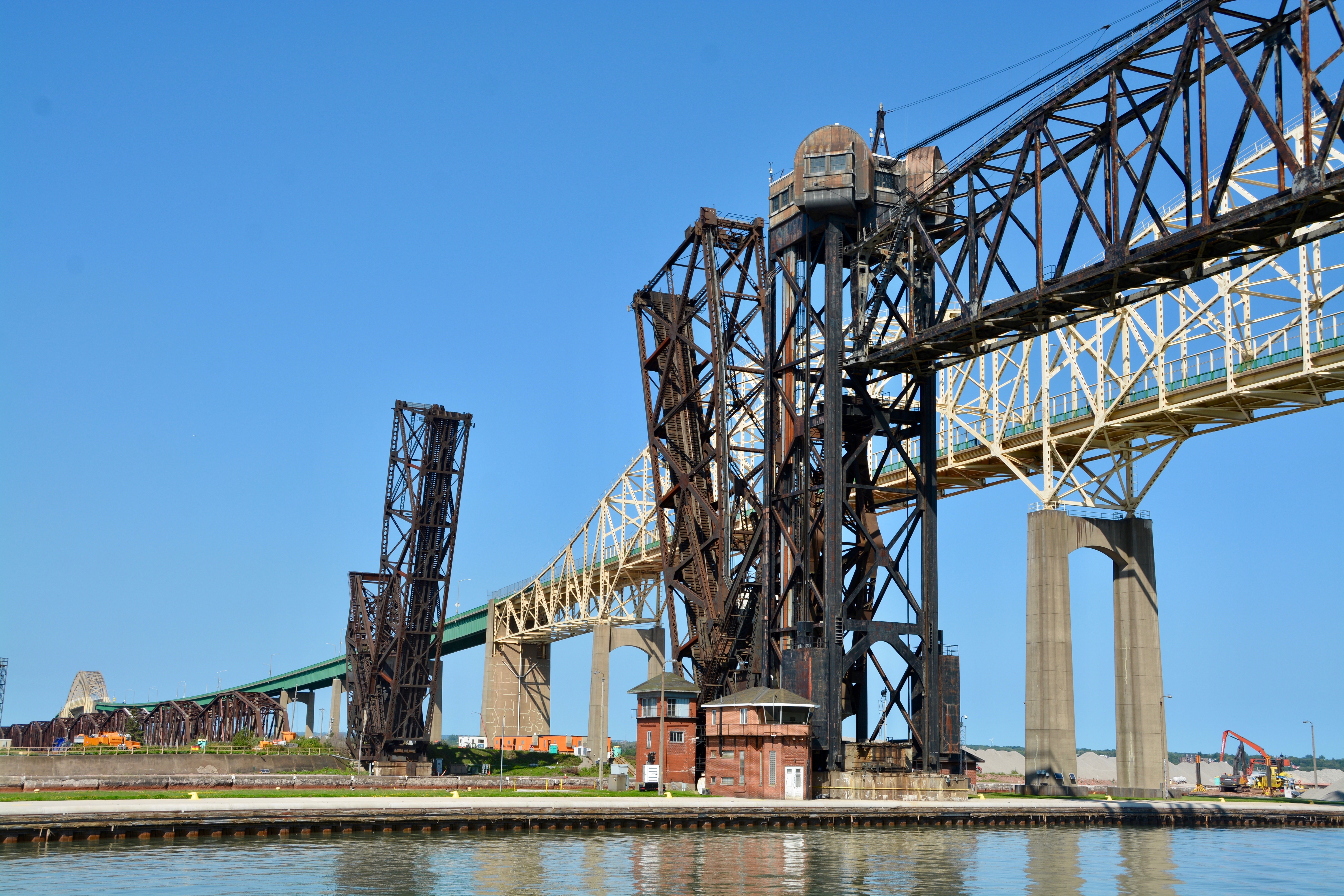 One of the most fascinating things I saw while passing under the Soo Locks International Bridge, was the railway line. Through one channel, the rail line splits and raises up on both sides to let ships pass. For the other channel, the railway line is lifted up instead. Even in inclement weather, an individual must climb up the outdoor ladder to the top to operate the controls to raise or lower the structure.