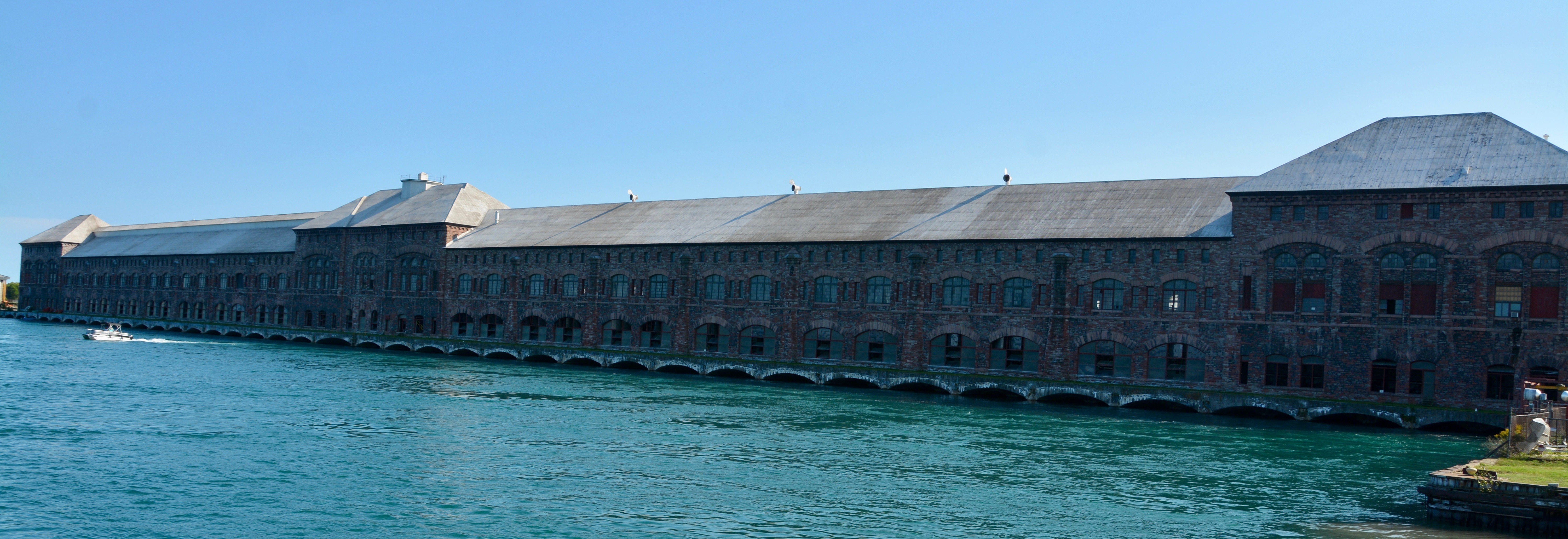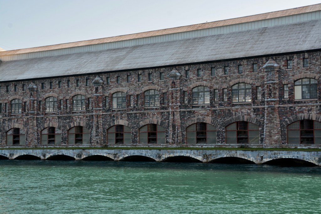 When we passed through Sault Ste. Marie earlier in the day one of the most intriguing things I saw was a long building so large I couldn’t photograph the whole thing except at an angle. I thought it was an old warehouse at first until I saw the sign. The older sign said Edison. The more modern one read the Cloverland Hydro Plant listing an original operation date of 1902. It is an impressive and beautiful brick building with wonderful glass windows from the Sault Ste. Marie side. At the end of the boat tour, I got a chance to see it from the water. It was even more beautiful from this vantage point. The captain pointed out that the arches were formed to resemble lighthouses, but only from the water side.