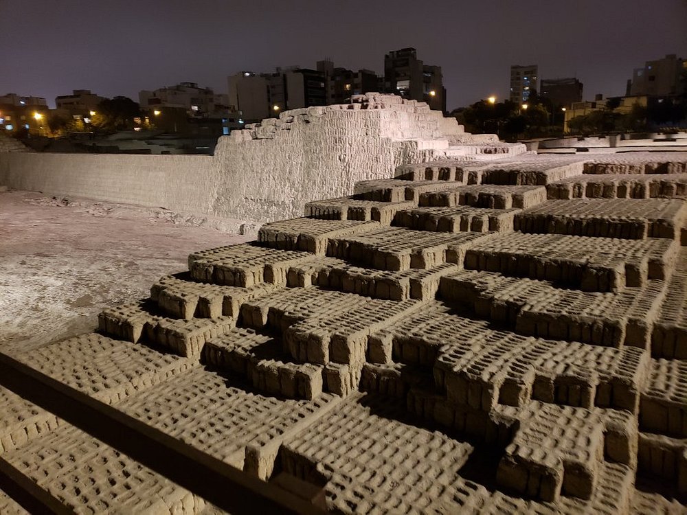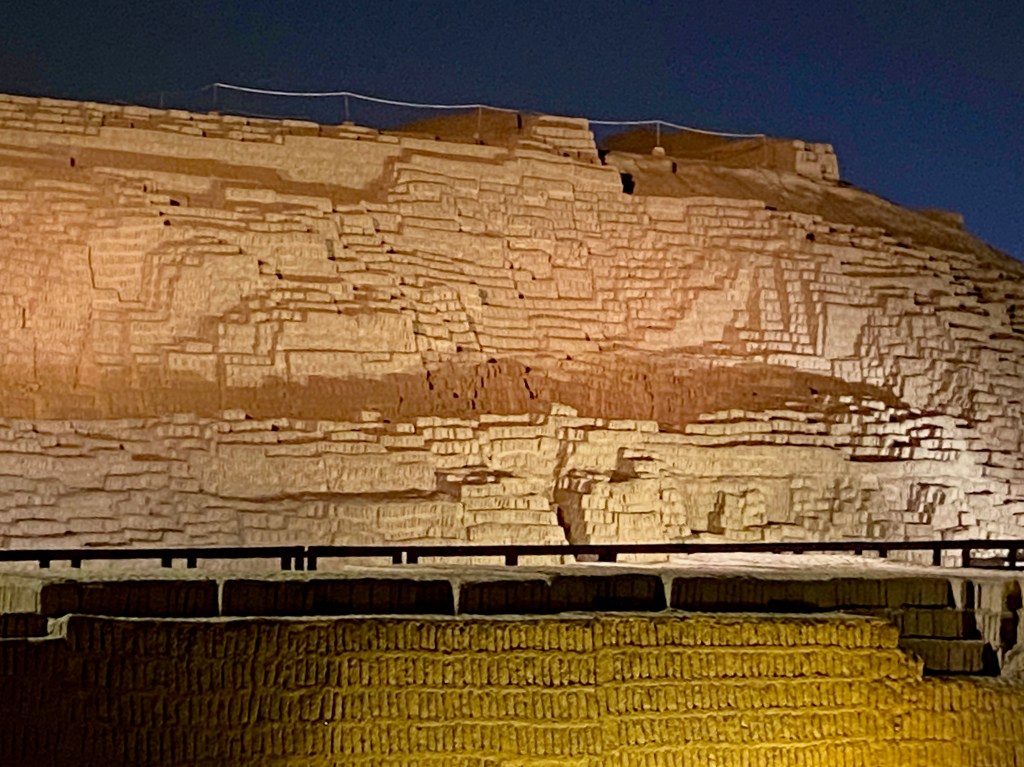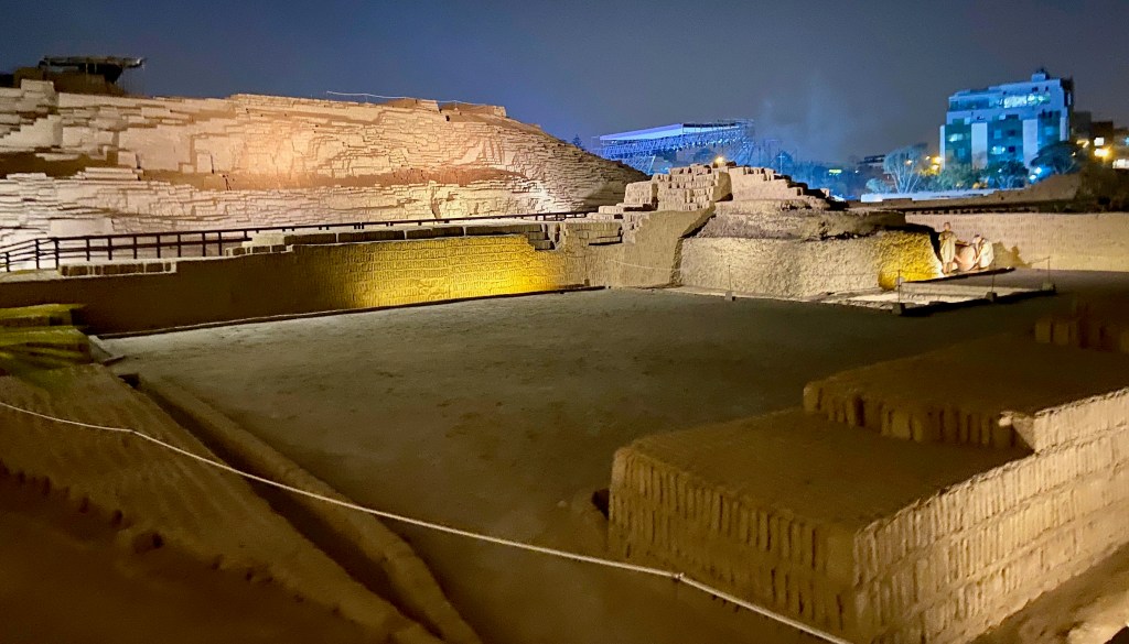 Boris had other plans. He wanted to take it easy for a while. He relaxed and napped, and we eventually took a cab to the Huaca Pucllana ruins for a tour and an early dinner at the museum restaurant overlooking the lighted ruins. Unfortunately, touring ended at 4:15, so we weren’t able to visit the entire site. A 2-3 hour tour is recommended. “Built [using] millions of adobe bricks, these ruins once served as an administrative center and a pre-Inca ceremonial site dedicated to the God Pachacamac.”