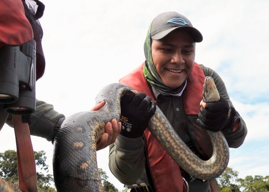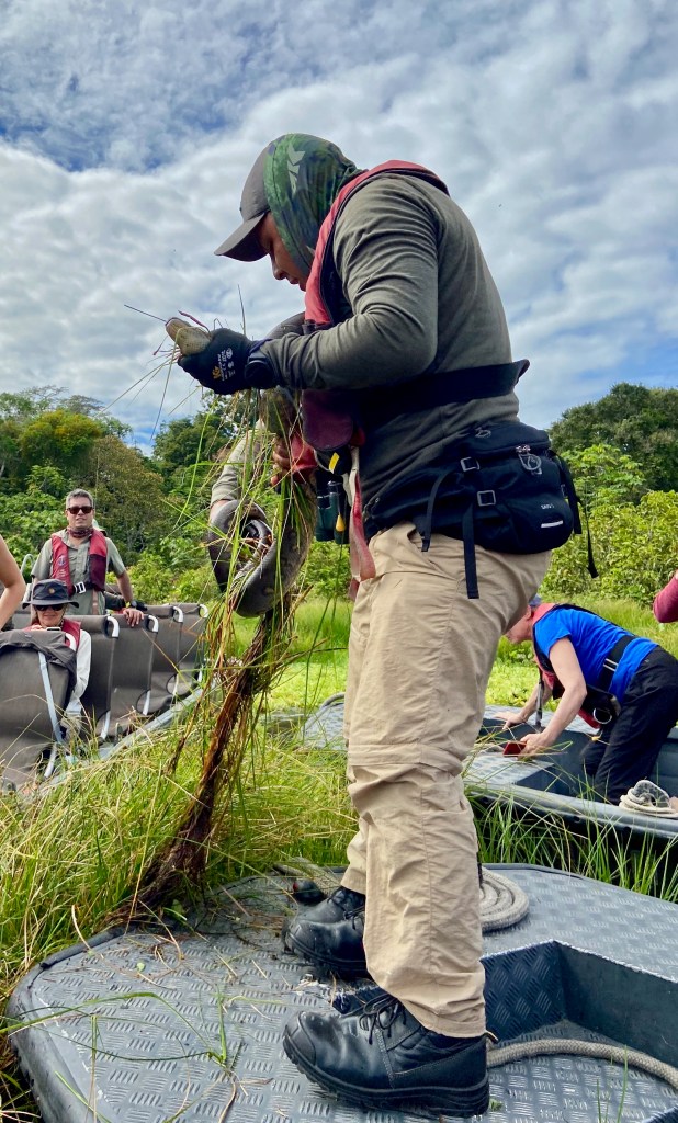 After breakfast, we headed off into a side lake with more water lettuce and tall grasses. One of our naturalists, Billy, appeared to be on a mission. Billy was always looking for the really cool stuff. Last night he was the one showing us the spiders and tarantulas and told us how rare it was to see those large schools of catfish at night. It came as no surprise that Billy was the one to find and get out of the tall grass our first anaconda of the trip. It is no easy feat getting it out of the water. He had spotted one yesterday, but it went under water before we got close enough to reach it.