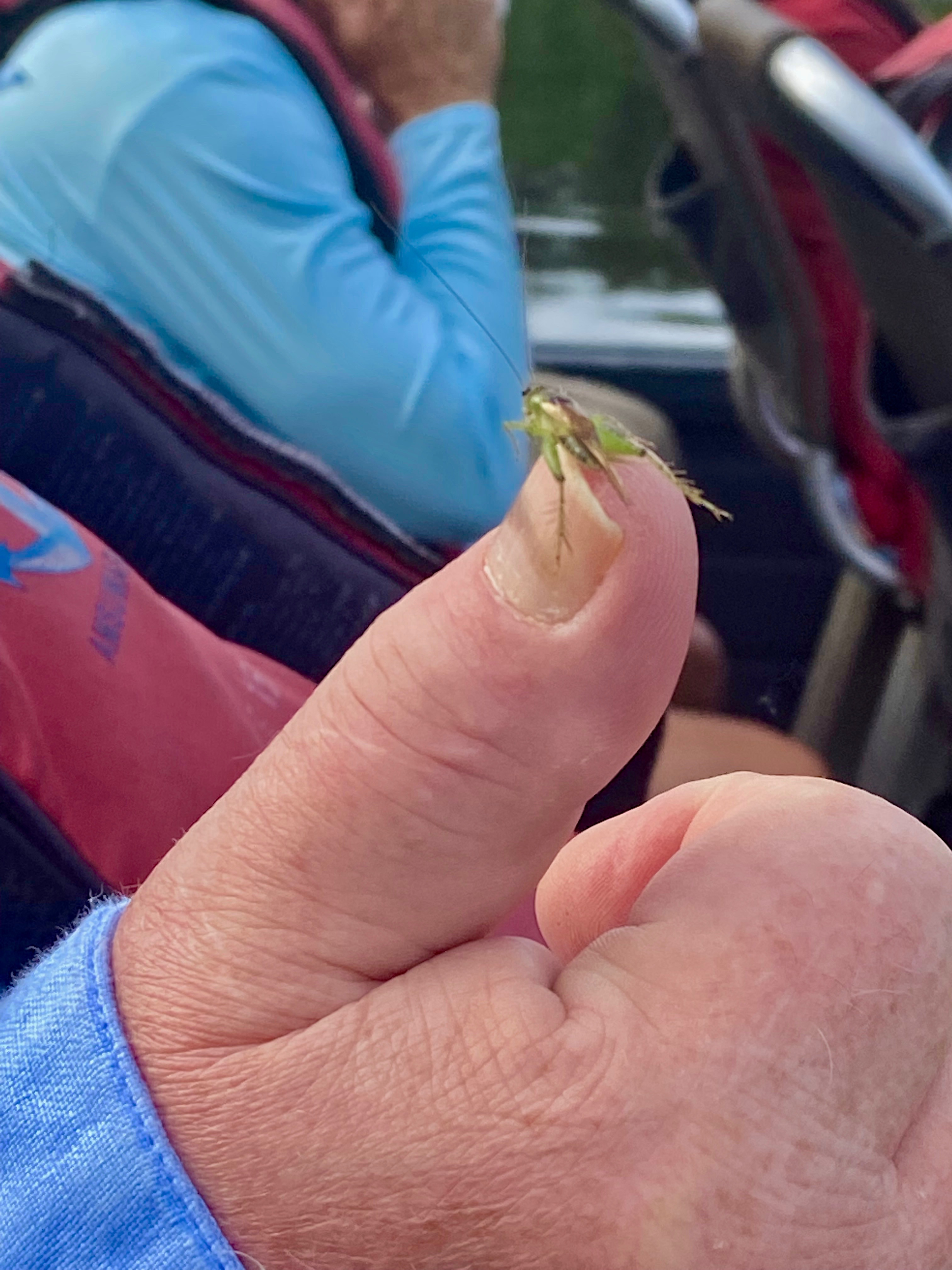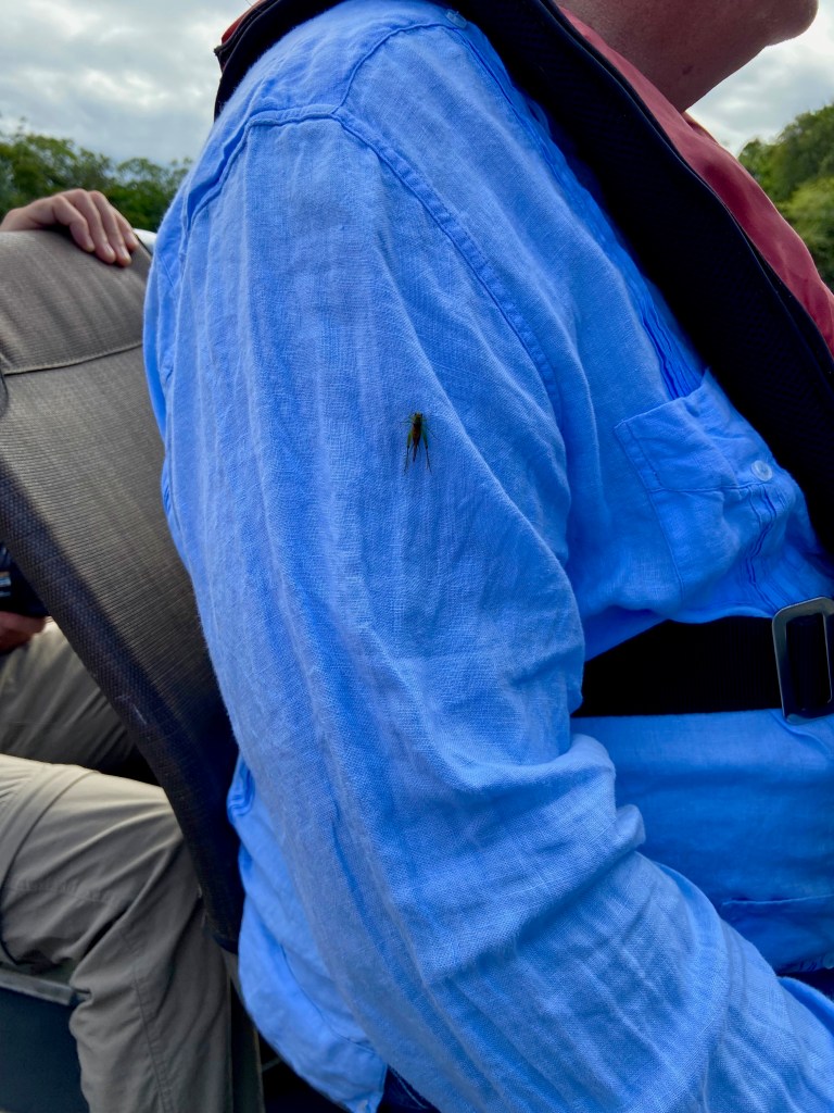 Boris didn’t take a turn, but that didn’t mean he wasn’t one with nature. He was the lucky recipient of a landing yesterday. He spent most of his afternoon skiff ride with a cricket sitting on his life preserver. Not be be outdone, today he once again found a friend that wanted to go along for the ride. He had both a before breakfast cricket, and an after breakfast one. Other boats would come up along side us just to see what animal had attached itself to Boris that day.