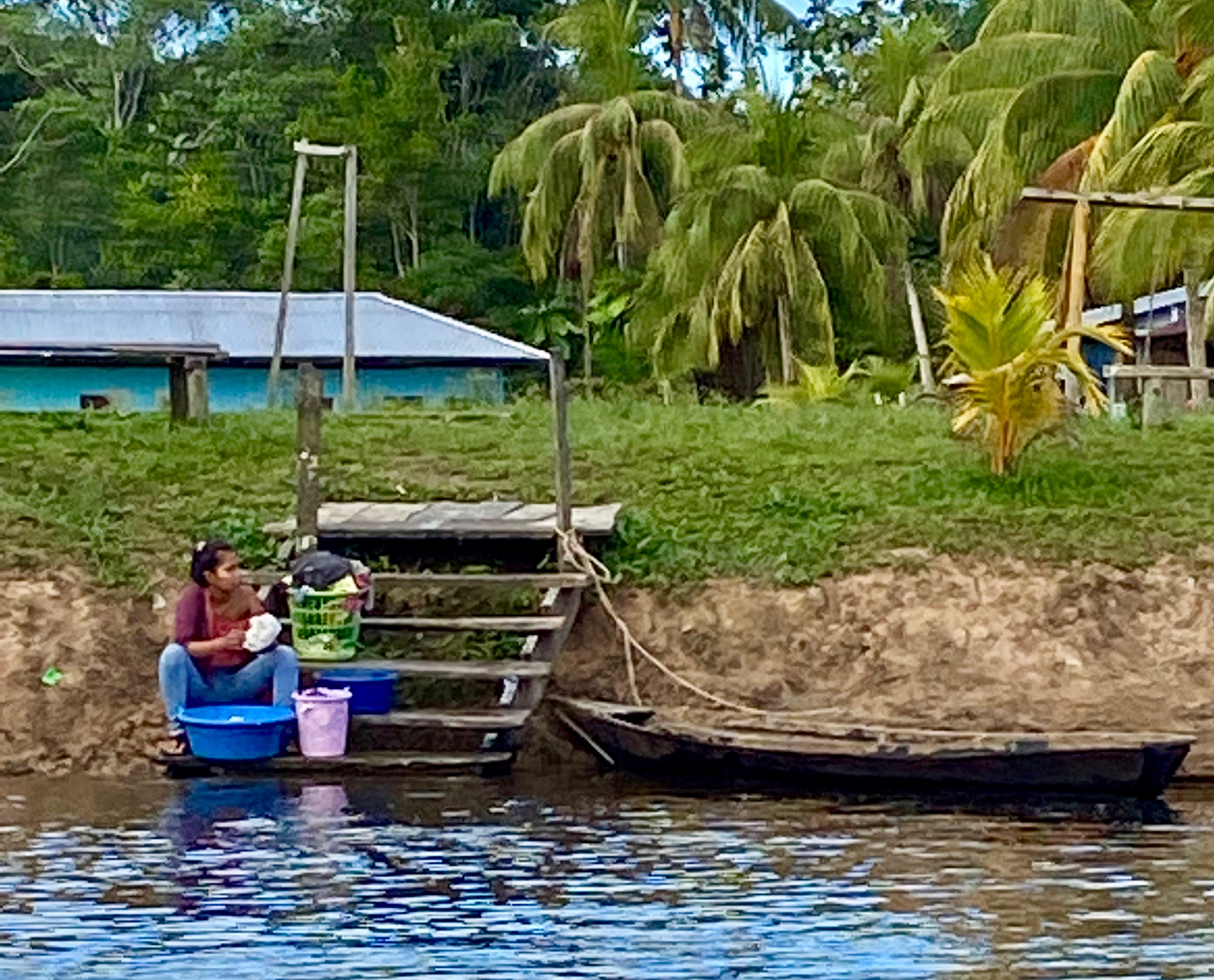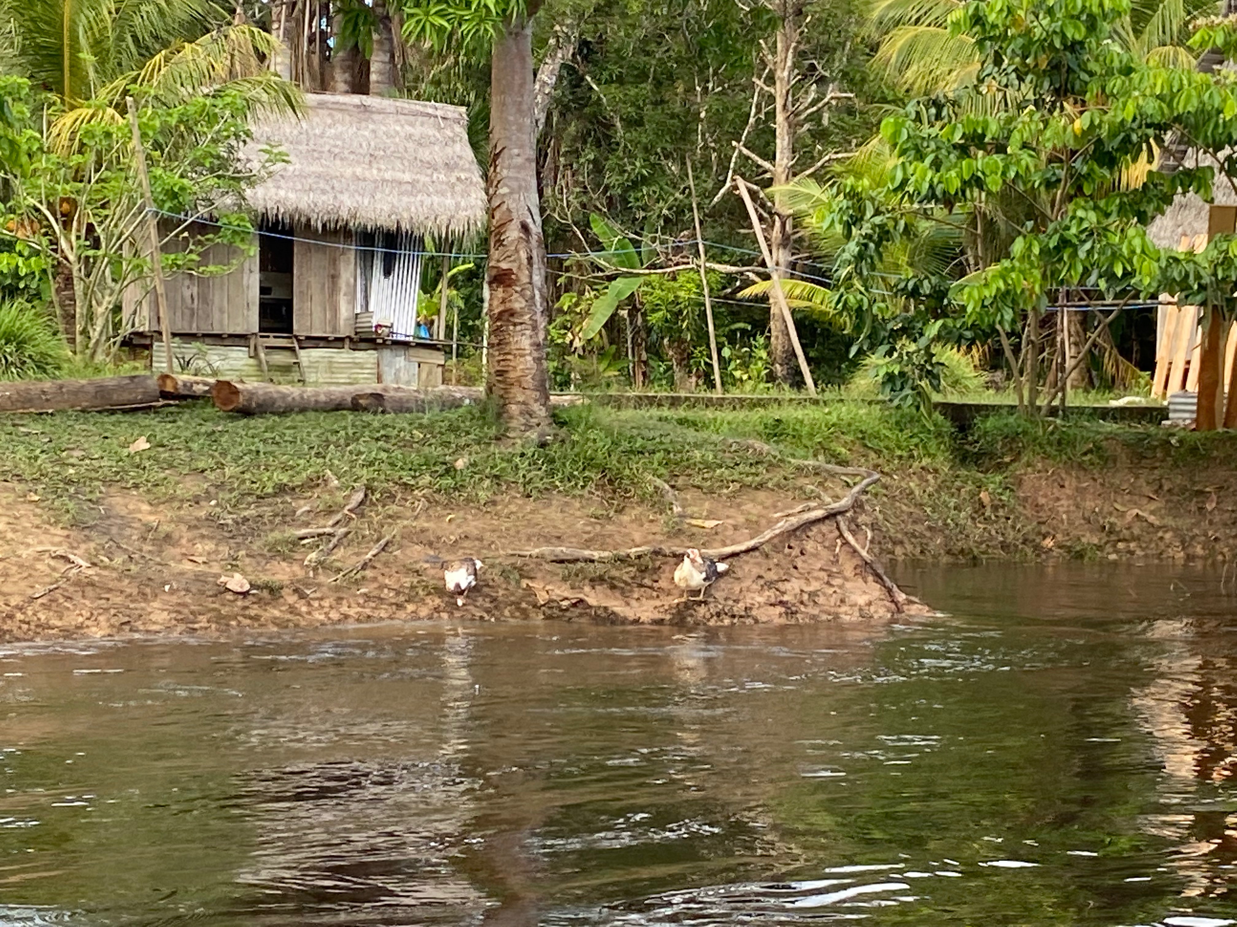 This morning we spotted several villages along the Amazon and families going about their daily routine. Although the larger villages have elementary schools (always a blue building), many have been underwater for most of the wet season and they are just drying out so the children will be heading back to school soon. We saw children out in the canoes fishing and they often gave us a friendly wave.