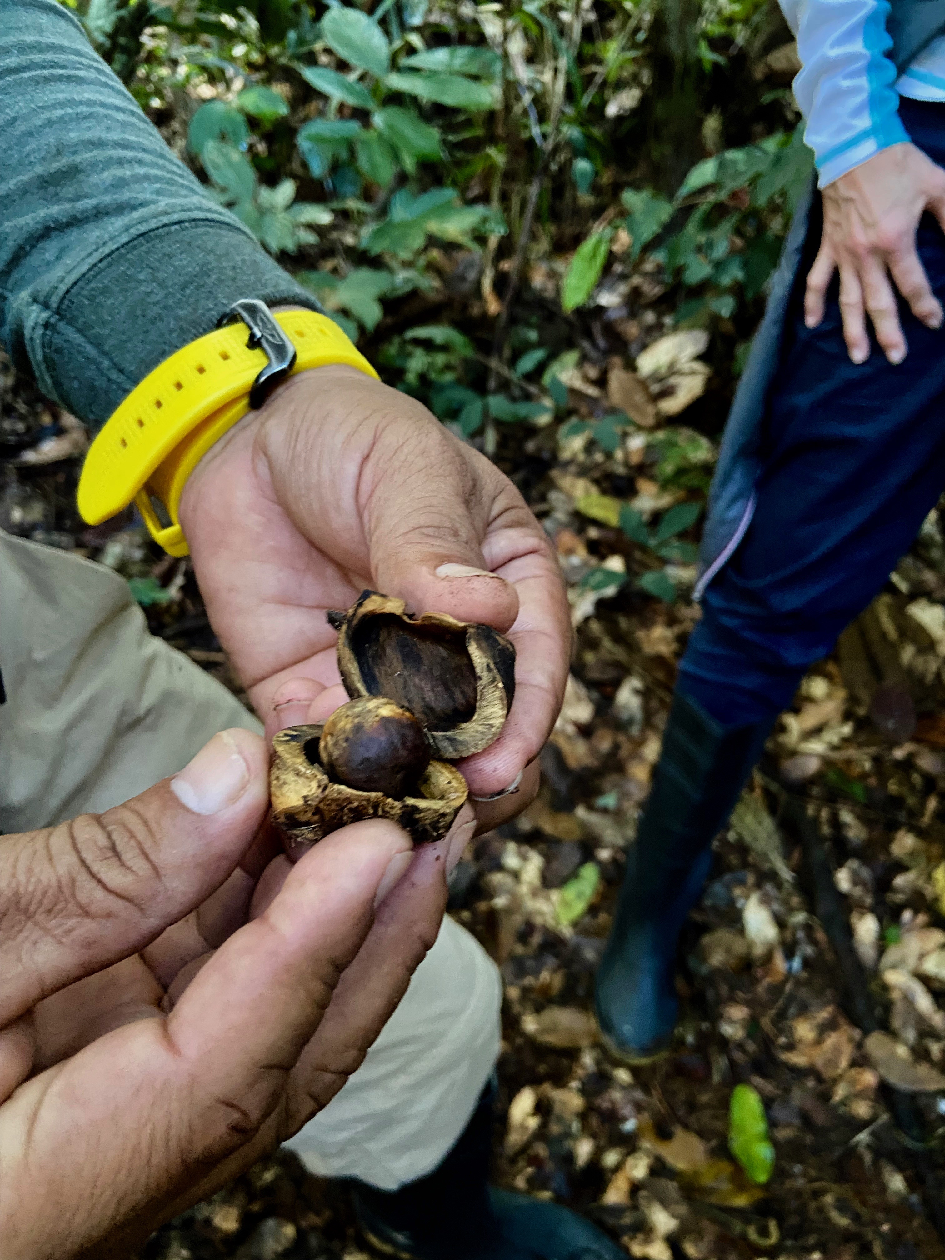 In addition to the rubber trees, there was other interesting trees. Some appeared to have multiple trunks (they grow that way naturally). There was another with lots of needles. The needles on the lower part of the trunk had been removed. These are the needles the villagers formerly used inside their blow guns. When he was growing up, Ricardo’s grandmother still had her blowgun in her room. All of the naturalists grew up in the Amazon.