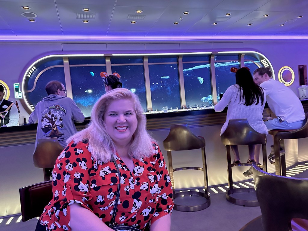 Afterwards we thought we would try our luck at getting into the Hyperspace Lounge since it was nearby on Deck 3. The reviews had all complained about getting in. When the ship first set sail you had to have a reservation, but that is no longer the case. During busier times, there is a sign out asking you to limit you stay to 45 minutes and they will deliver the check to insure you keep to that time frame. We actually headed right over after the show and got in this small venue. There aren’t a lot of decorations, but the highlight is the window. The idea is you are on a lounge on a cruiser in space and periodically the cruiser goes into hyperdrive and you are transported to outside another planet with a different view outside the window.
