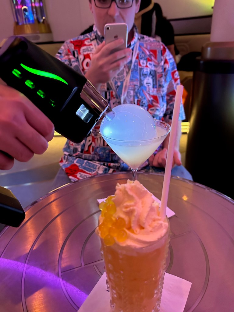 The other draw is the clever drinks, especially those where the server forms a bubble on top that grows and eventually breaks into smoke. There are some pricier options, but most of cocktails range from $15-20. We had such a great time, chatting with other patrons, watching the planet window and hyperspace mode, and trying out the cocktails.