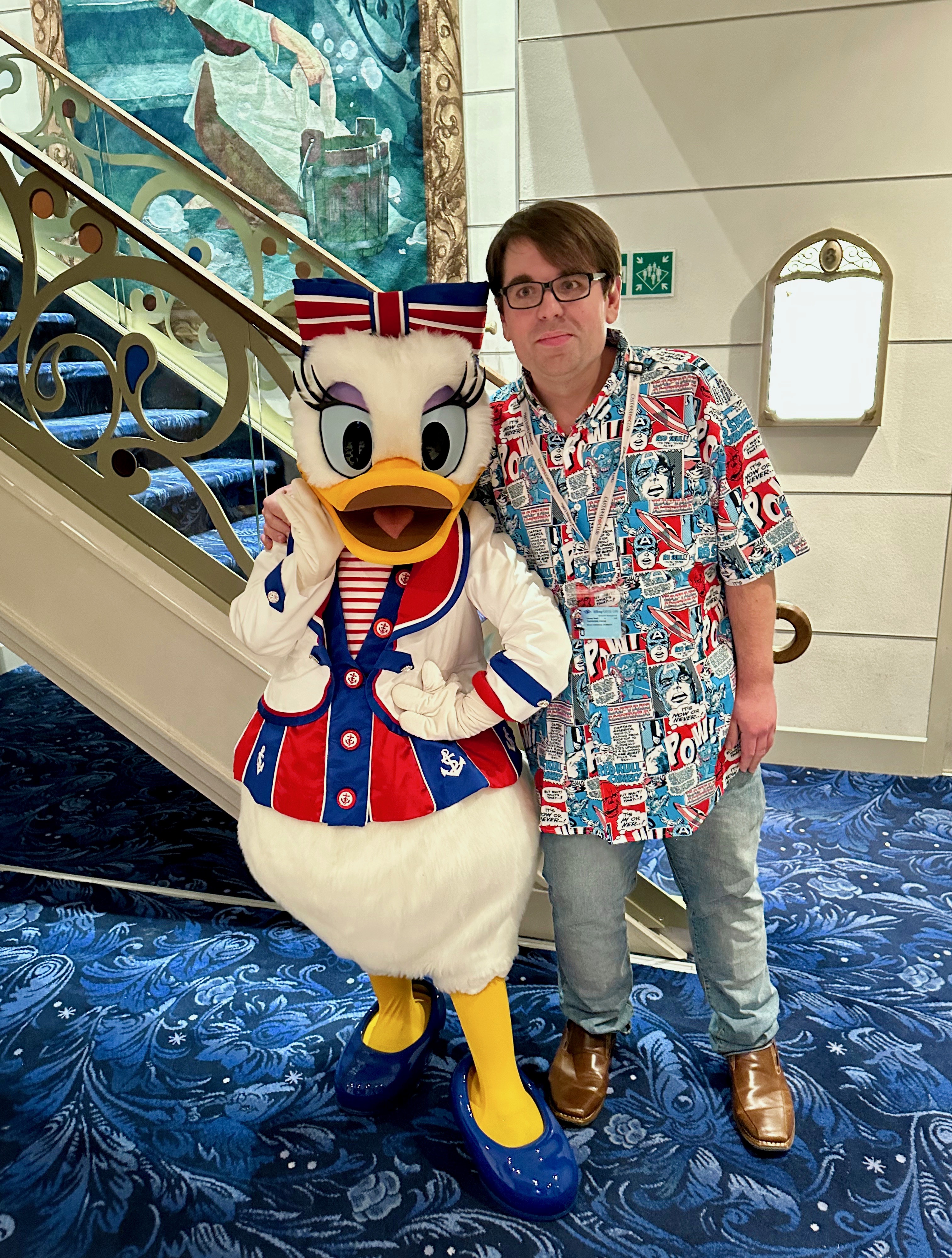 Finding activities aboard the Disney ships is a little different than it has been in the past. After both dinner seatings and both of the main stage (Walt Disney Theater) performances are over, there is lots of activity in the main hall on the multiple decks that open to it. The photographers are finishing up with the optional background photos and lots of characters are milling around. We walked by Daisy Duck and had to get a photo for my mom. It is not so much the character that she loves, but my Dad did a great Donald Duck imitation so she identifies with his sweetheart Daisy. There are no longer any printed schedules on the Disney cruise ships. The Navigator is now available via the cruise line app. You put your phone in airplane mode and log into the Disney wifi (free of charge) to use the app. Other internet access comes with a fee. It took me a while to find things on the app and some of the program descriptions weren’t clear, but we used it to decide where we were headed after dinner.