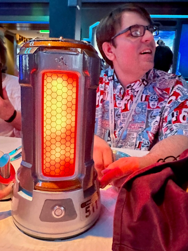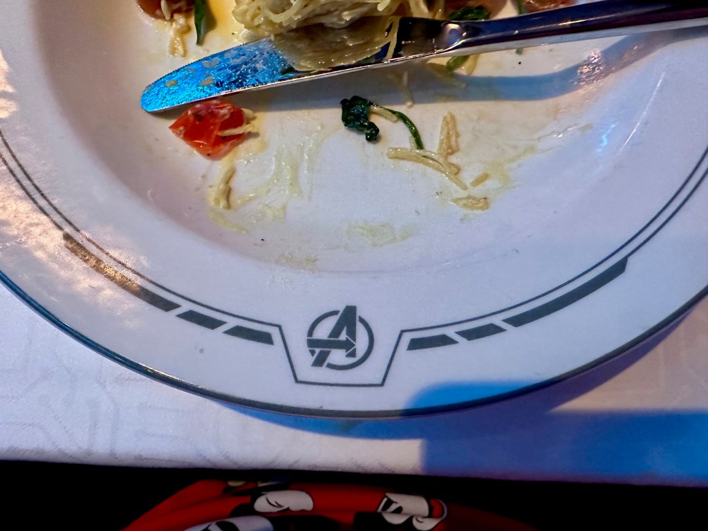 Once everyone was seated, met the servers, and ordered, the screen show began. There is a story and build up to a big finish. Parts of the event are interactive using a device that sits on the table. Both the 30-years-olds at our table really got into it. The story develops in parts, but the screens are also on and showing pictures throughout the dinner. Dinners are multiple courses and you can have has many or as few as you would like. They also take the theme seriously with the tableware featuring the Avengers logo.
