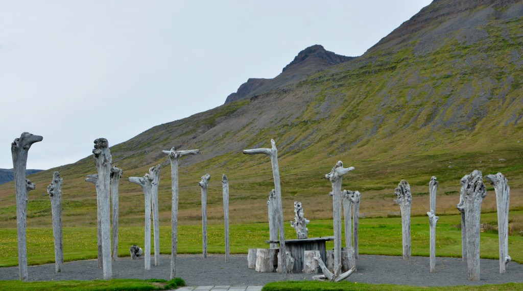 Sudavik was the site of a major avalanche in 1995. 14 people were killed and many buildings were destroyed. Although we saw examples of manmade avalanche walls in the area, the decision was made to move the town rather than risk a future drop off overwhelming a new avalanche wall. Only a few houses survived the disaster: these homes are currently only open in the summer months as guesthouses. Fifty-one new homes were constructed in the new town (which is just next to the old town) and eight homes were moved to the new settlement. A formal avalanche memorial as well as informal one created from whale bones sits next to a very popular children’s park in the original Sudavik. The old town in maintained for tourists.